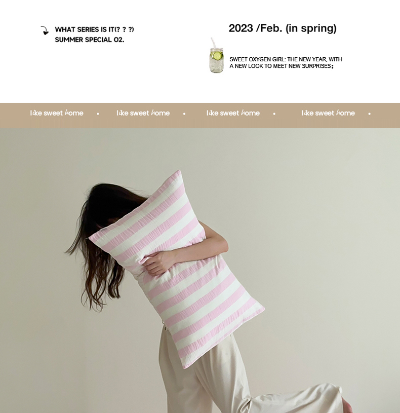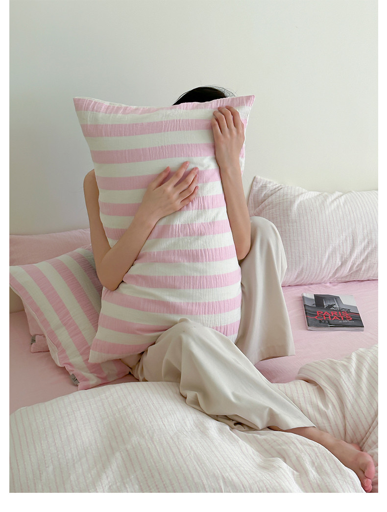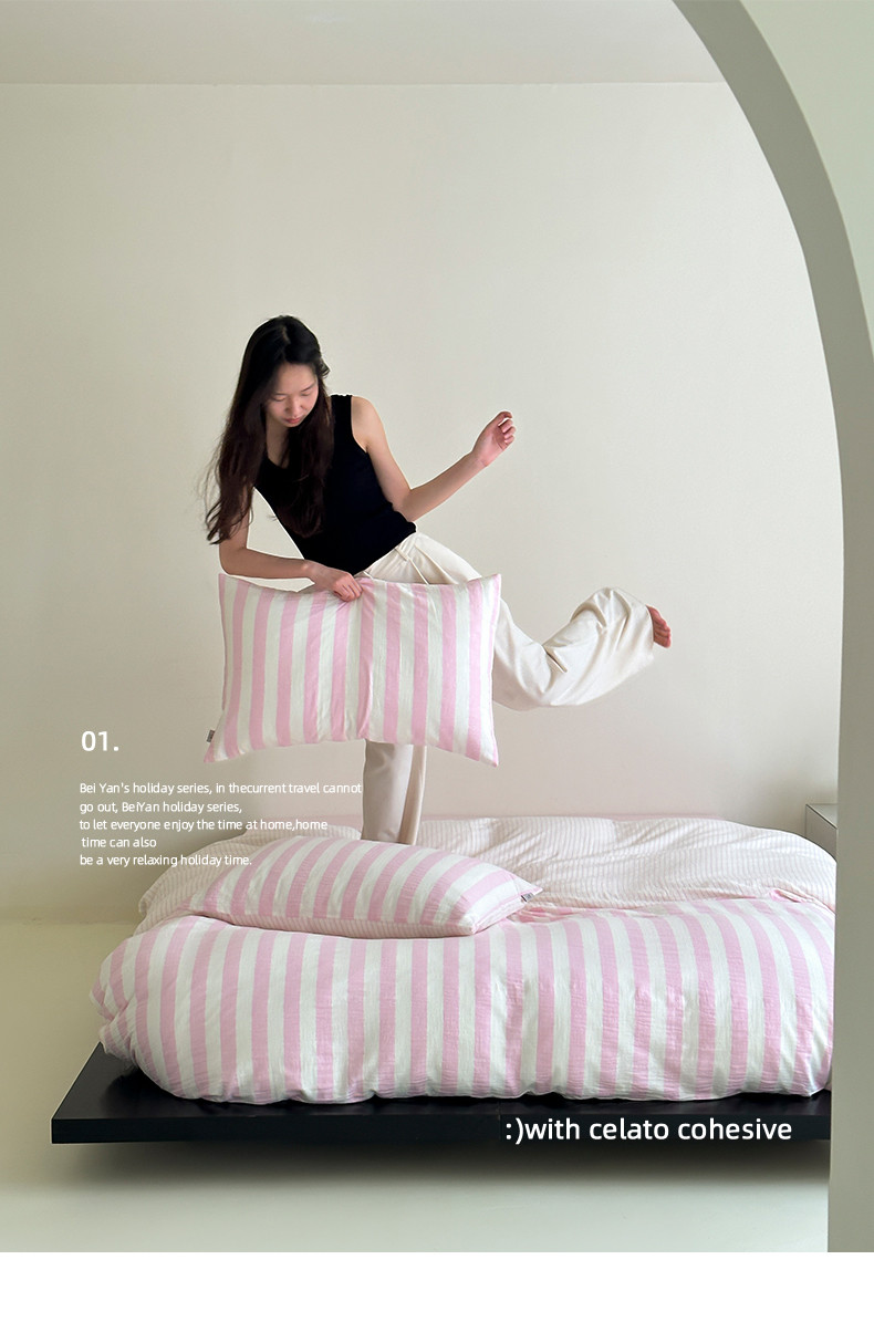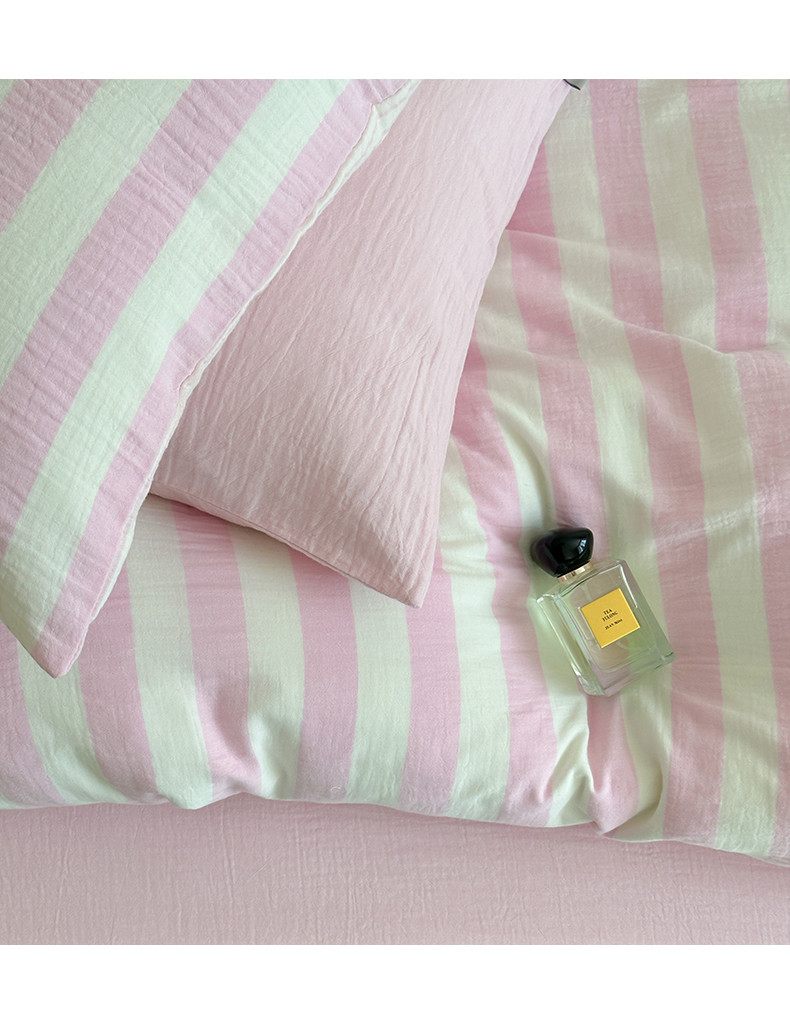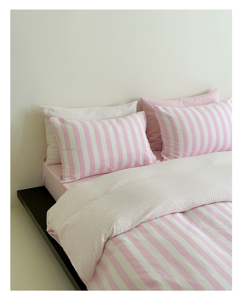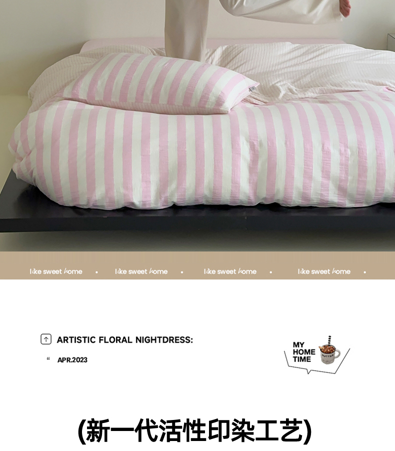 商品名称:玛奇朵 2023新款色织双层皱纱-韩系条纹四件套 韩系条纹-桃粉