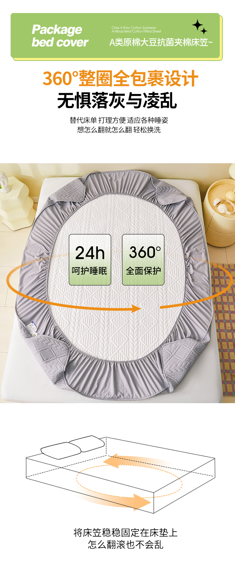 (总)伊人坊 2025新款A类全棉纯棉100s夹棉床笠,砂糖粉,星辰灰
