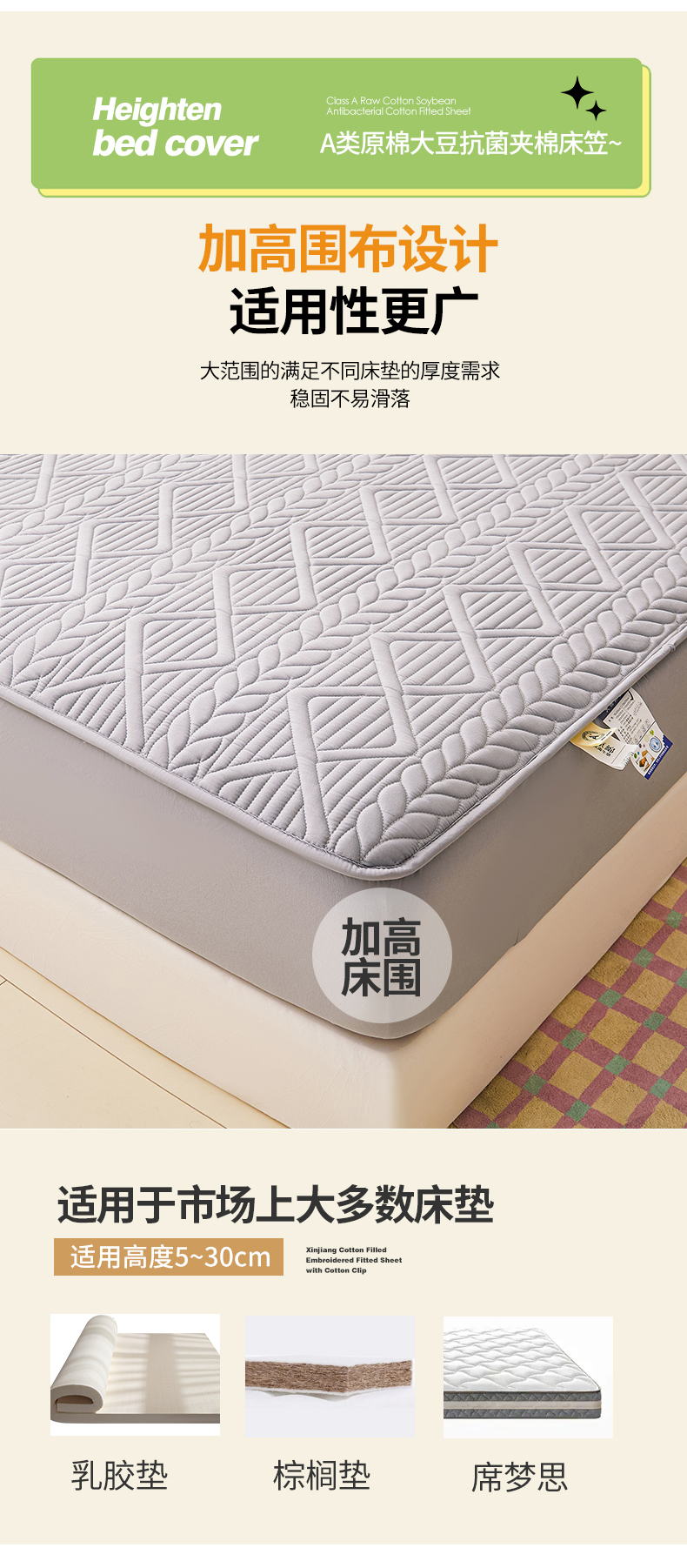 • 91家纺网 家纺一手货源 找家纺 (总)伊人坊 2025新款A类水洗棉六面全包棉花夹棉床笠,爱心粉,五星灰,五星咖色,五星粉,五星米白,爱心灰,爱心米白,爱心咖色