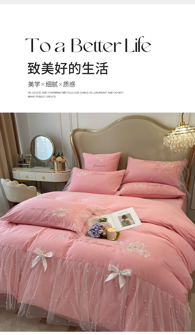 商品名称:绒世界 2024新款全棉蕾丝珍珠网纱四件套 丽丽贝尔系列 玫瑰粉