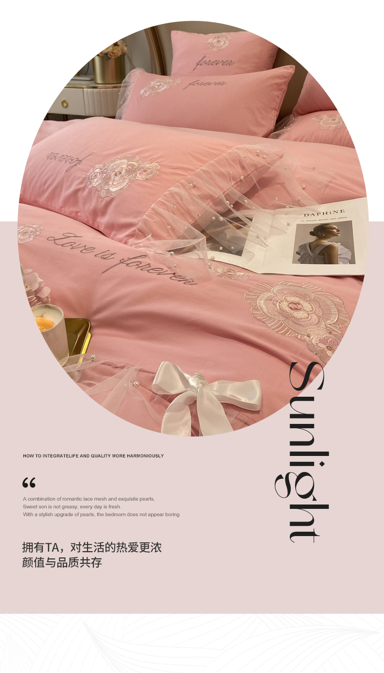 绒世界 2024新款全棉蕾丝珍珠网纱四件套 丽丽贝尔系列 玫瑰粉