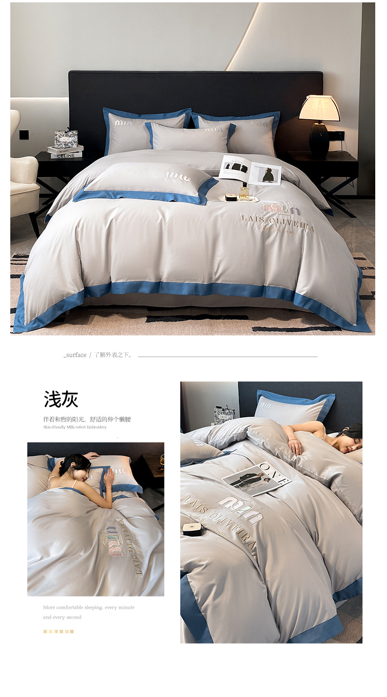 遇见家居生活馆 2024新款亲肤磨毛刺绣四件套-克洛伊 克洛伊-浅灰