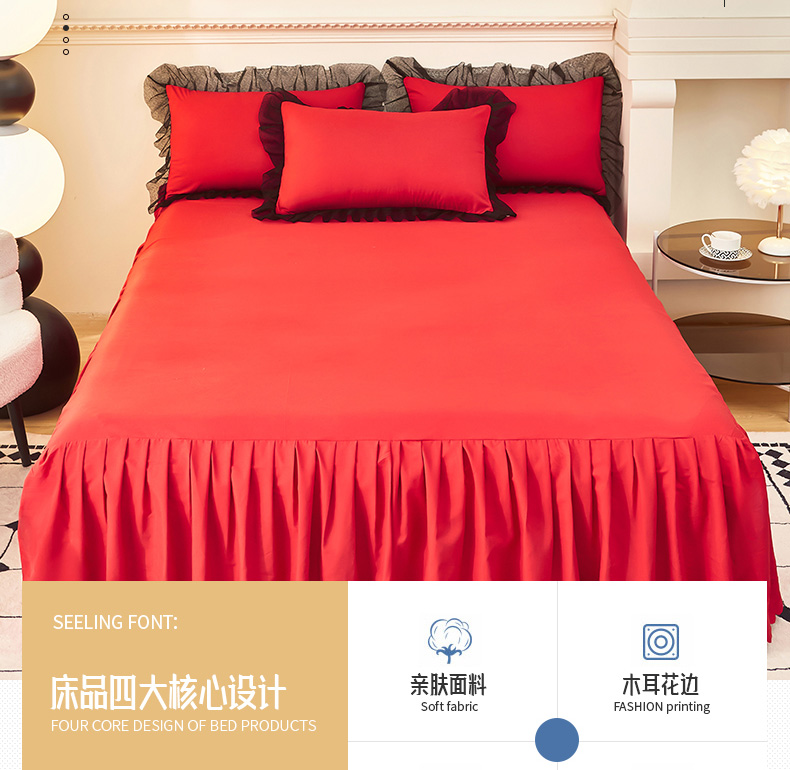 莉莉安家纺 2025新款亲肤磨毛木耳花边床裙款单床裙 爱丽丝-千禧红