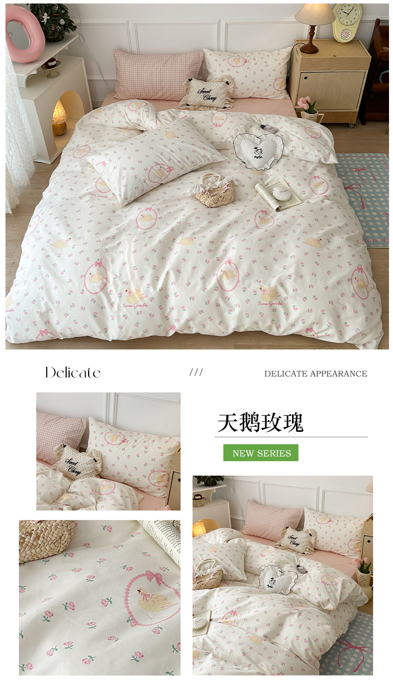 昔可家纺 2024开春新款全棉印花卡通四件套 天鹅玫瑰