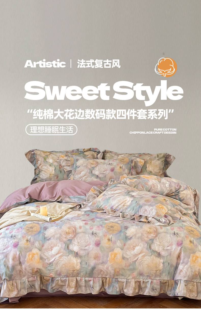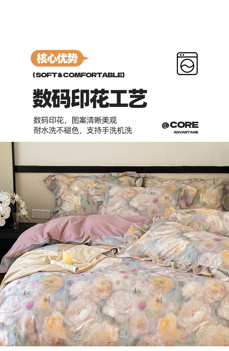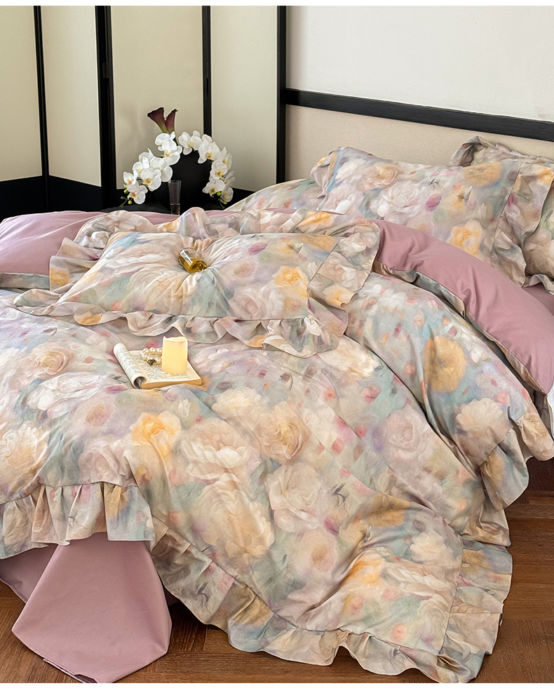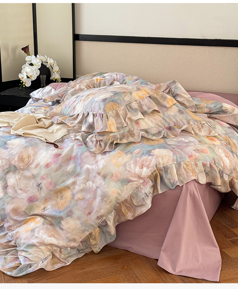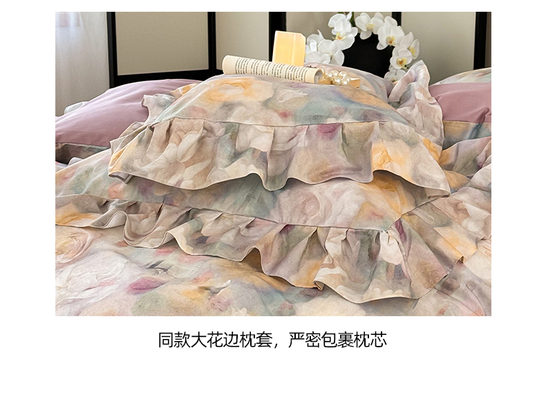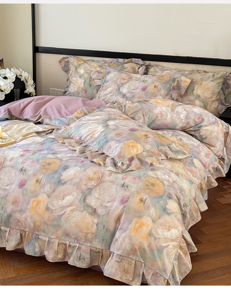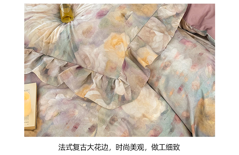 (总)窝米 2025新款数码印花100支长绒棉纯棉工艺花边款四件套-晚意,晚意
