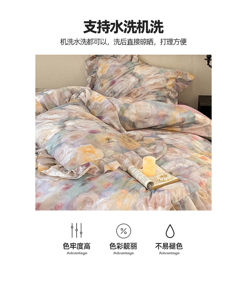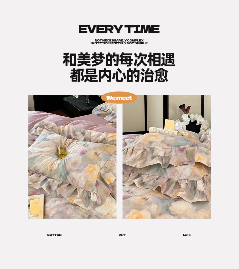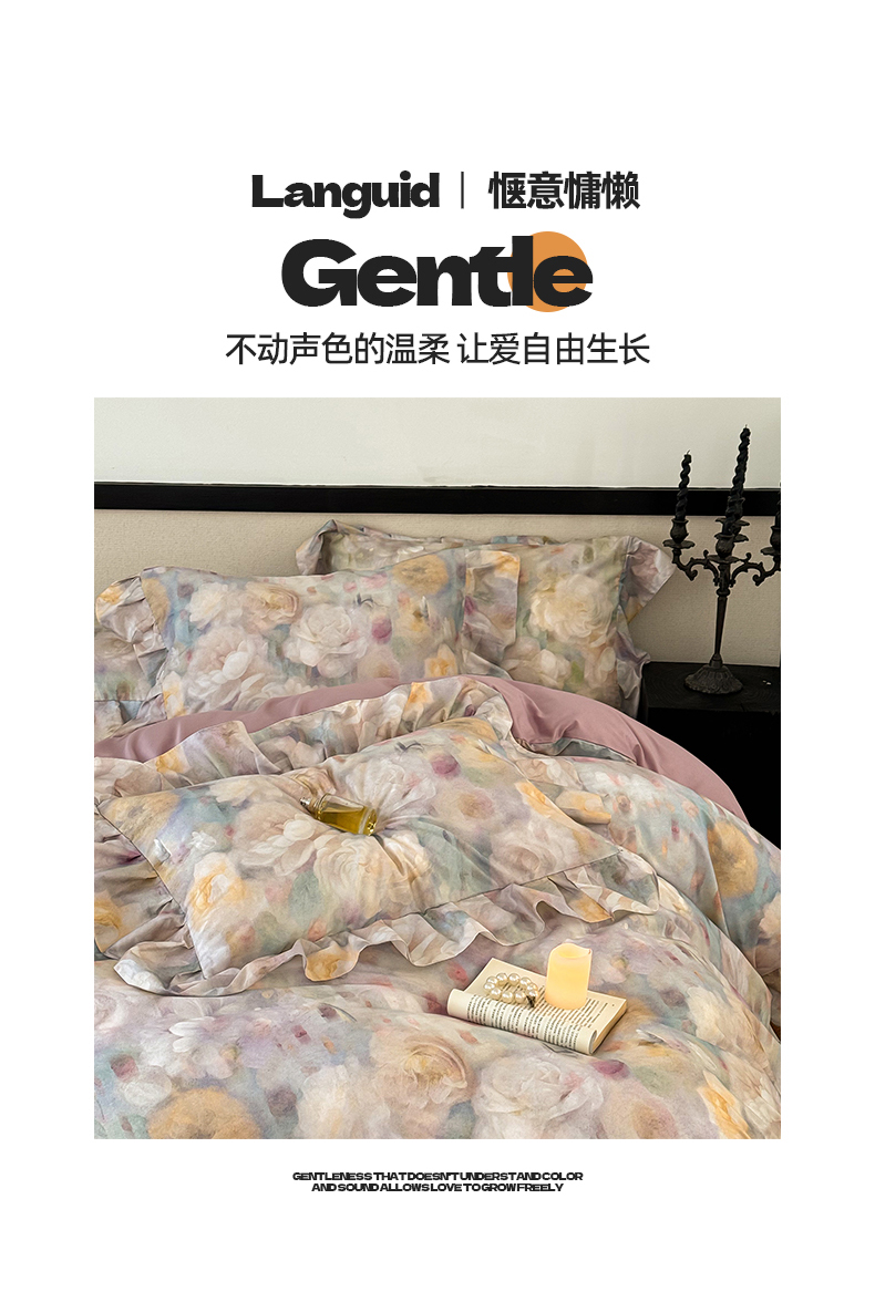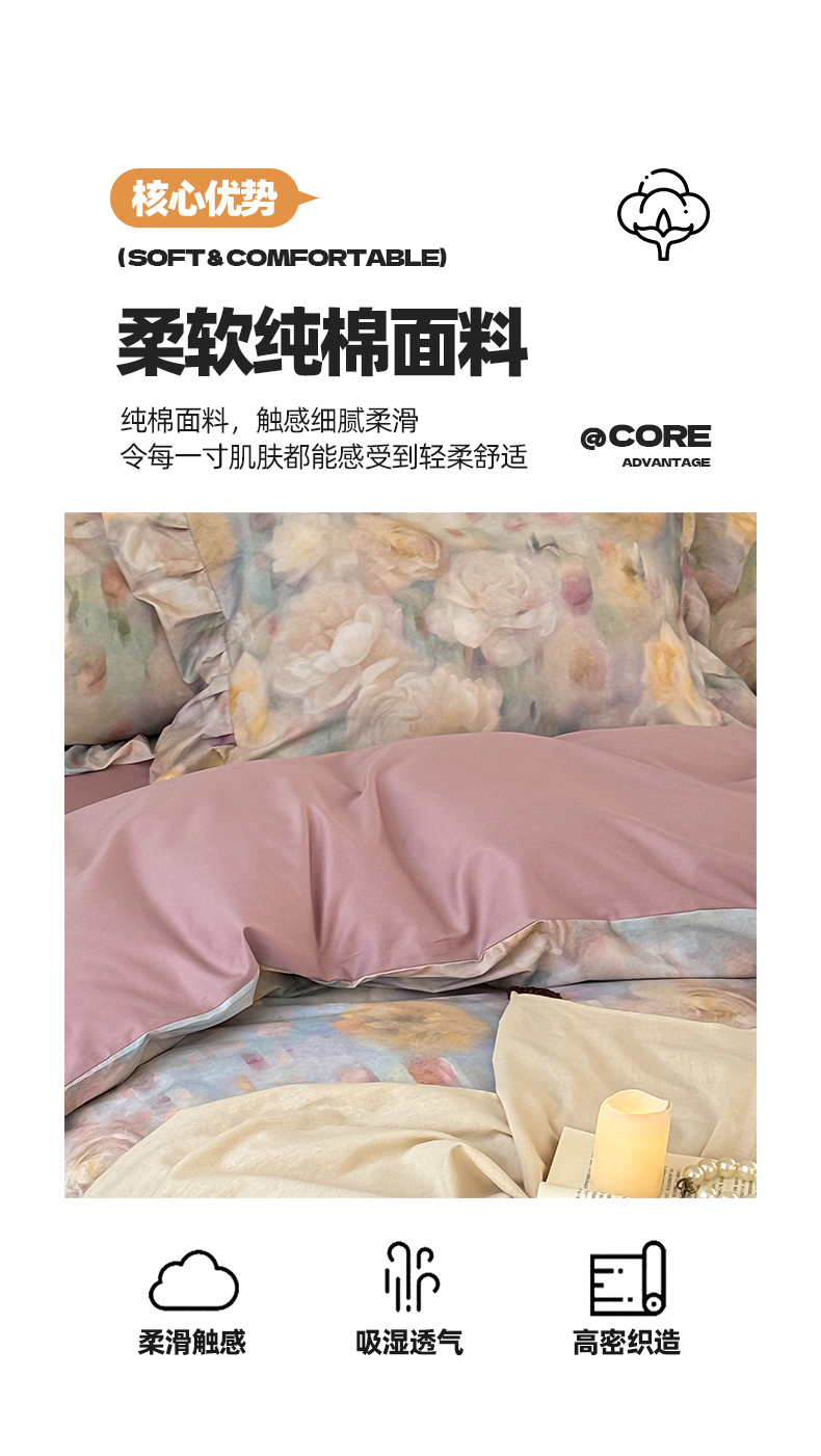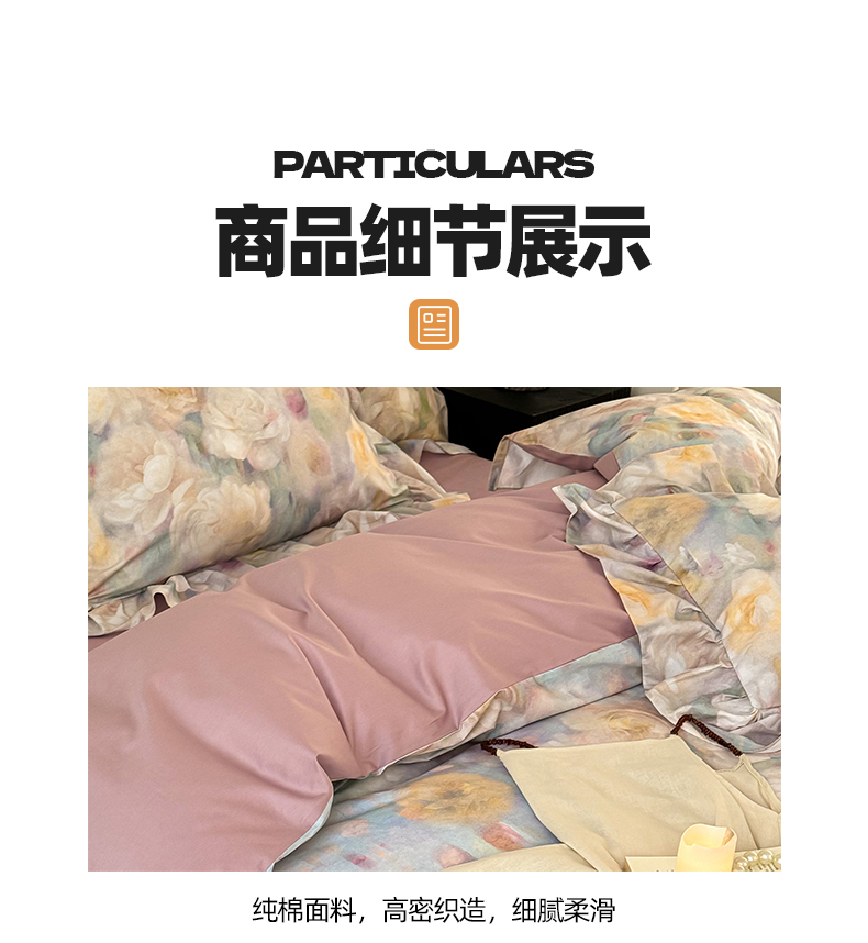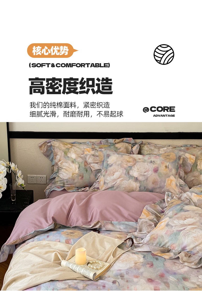 (总)窝米 2025新款数码印花100支长绒棉纯棉工艺花边款四件套-晚意,晚意