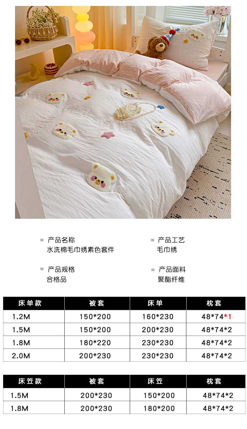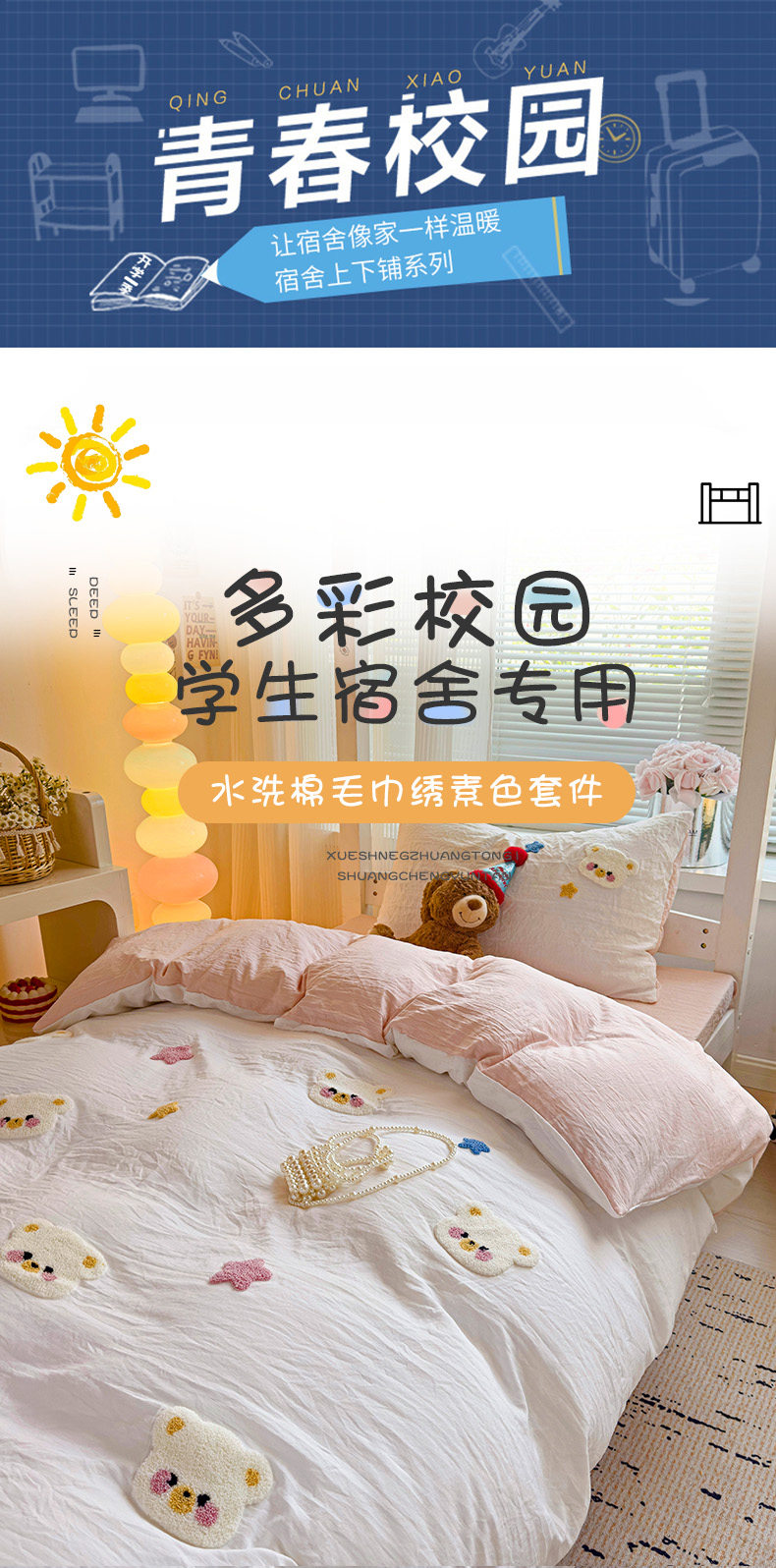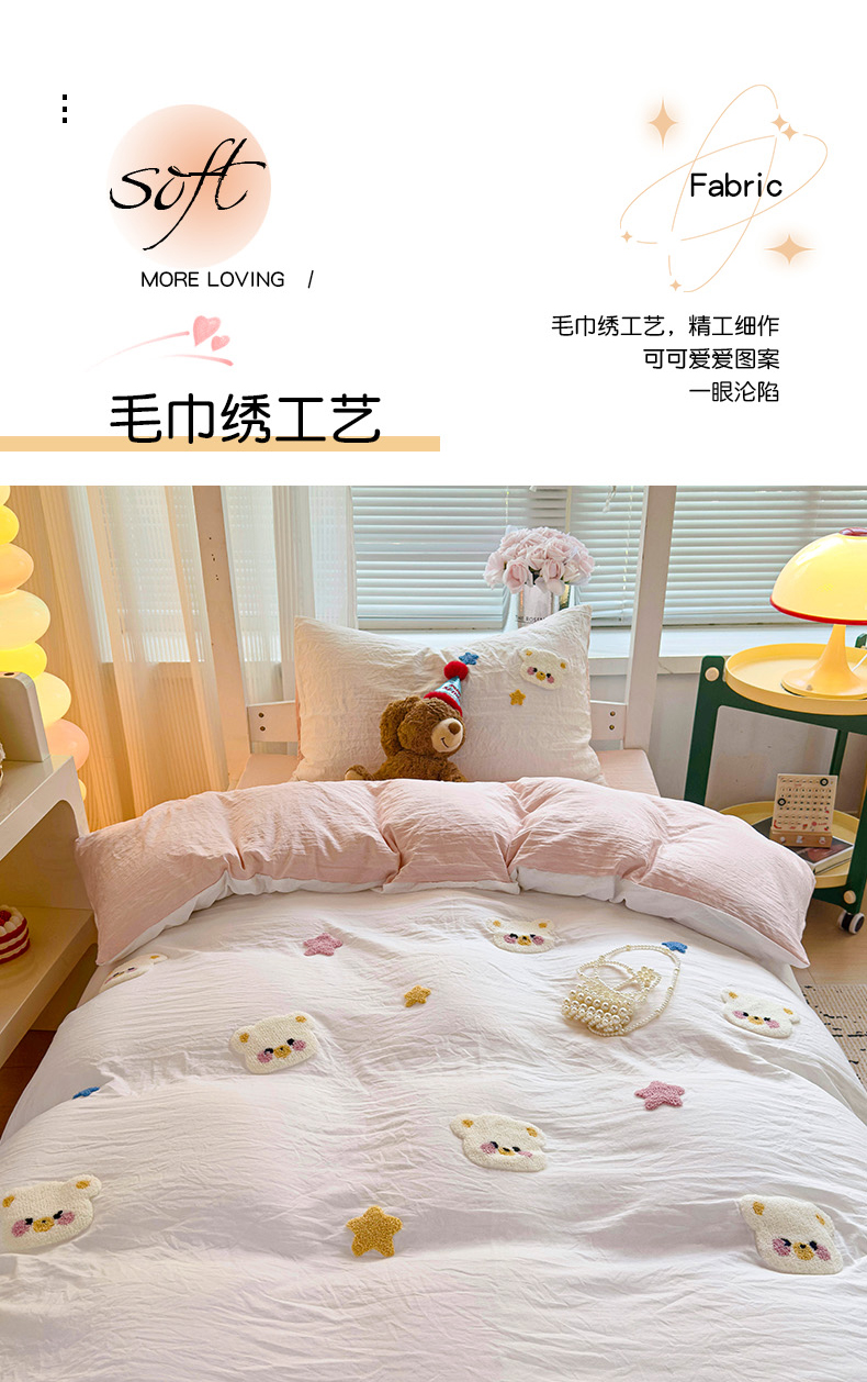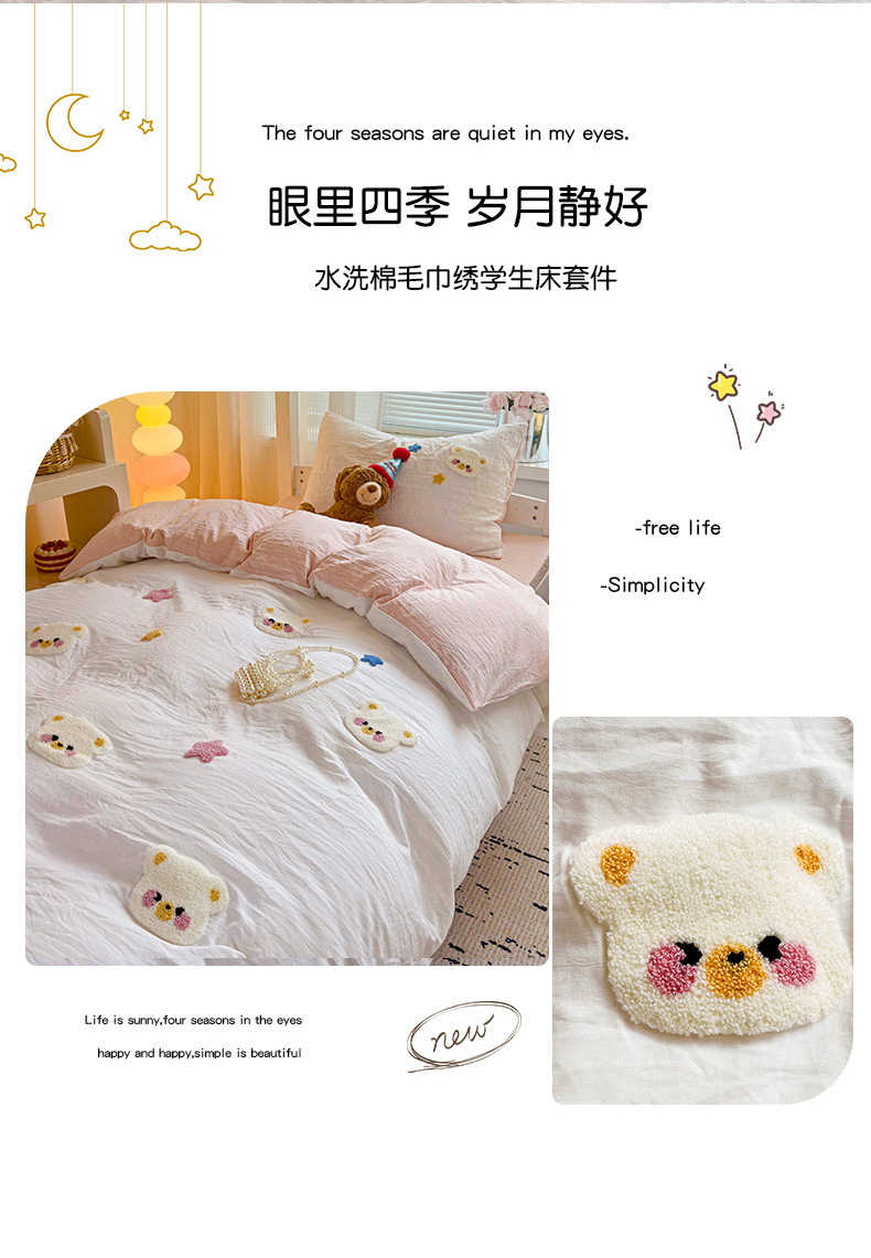 商品名称:韩巢家纺 2024新款超柔水洗棉毛巾绣学生宿舍上下铺专用单件被套-幸运熊系列(提供卖家秀) 幸运熊奶白浅粉