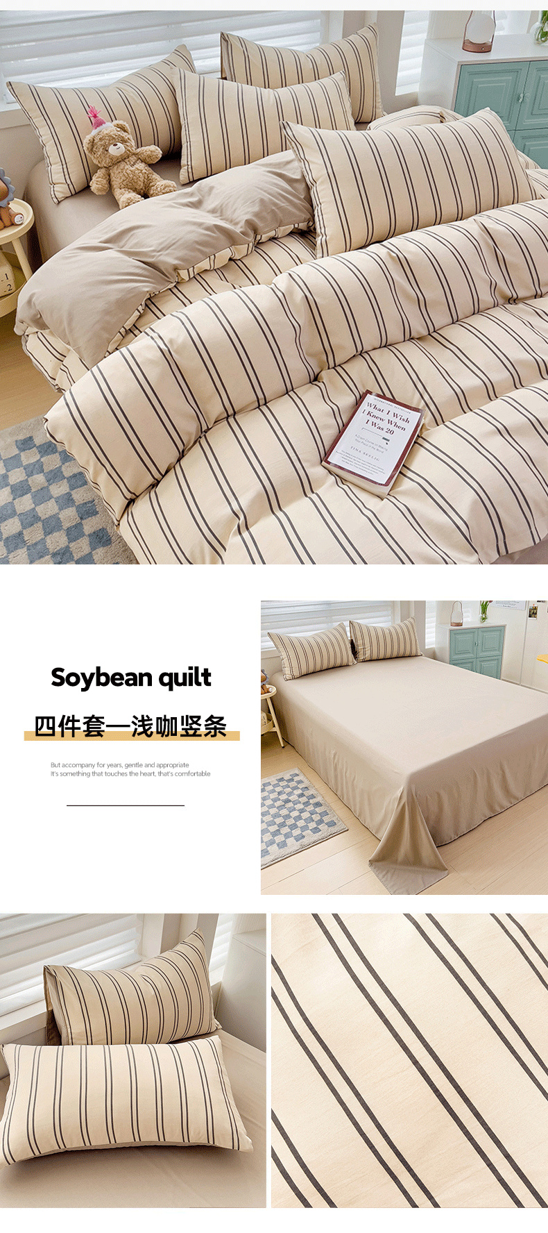 商品名称:赫然 2026新款水洗双层纱四件套 浅咖竖条