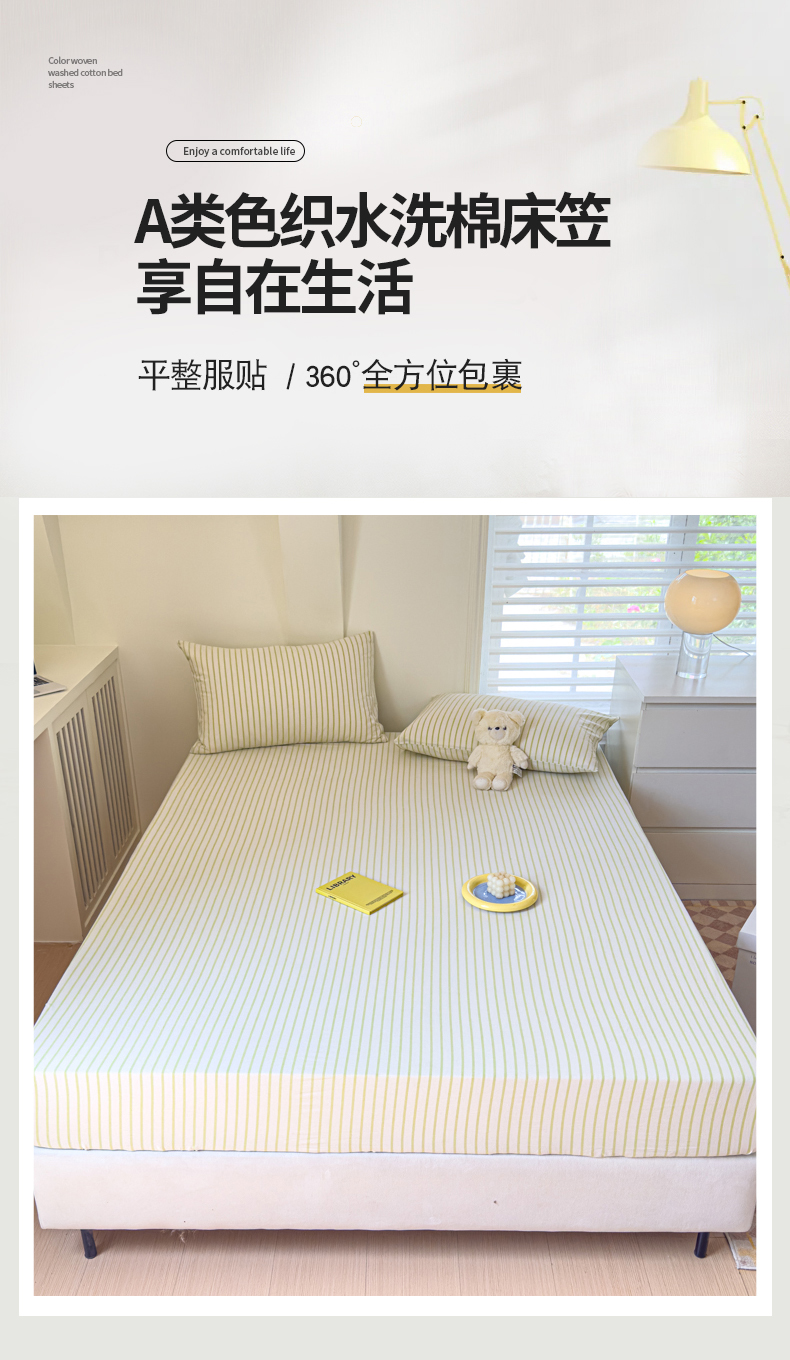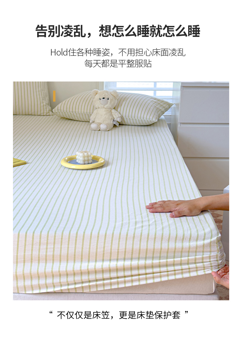 • 91家纺网 家纺一手货源 找家纺 金丝鸟家纺 2024新款A类全棉色织水洗棉床笠系列 果绿中条