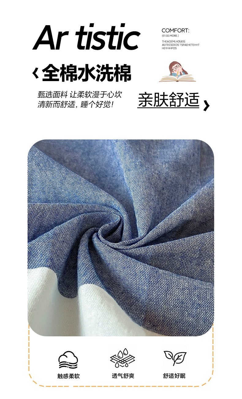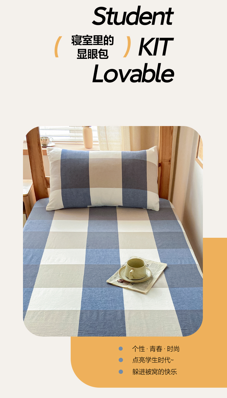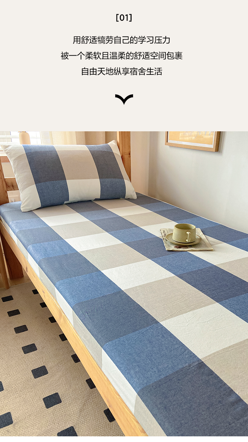 • 91家纺网 家纺一手货源 找家纺 卡伦家纺 2025新款全棉色织水洗棉单层宿舍学生床笠 蓝大格