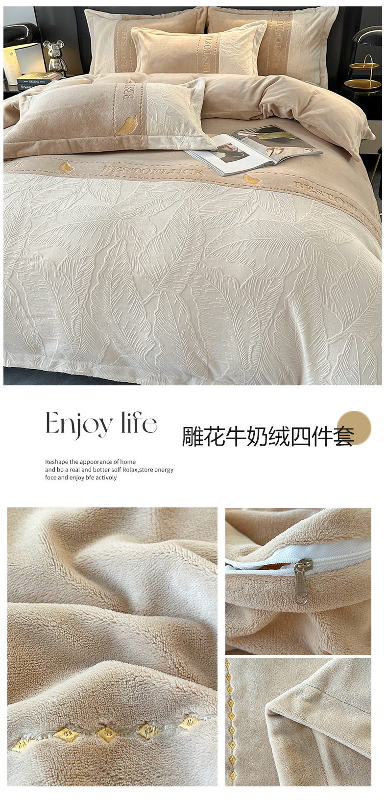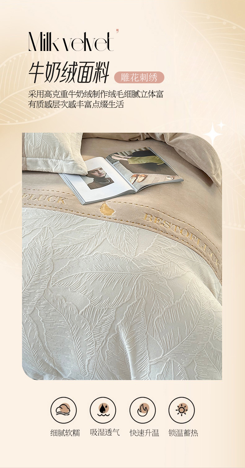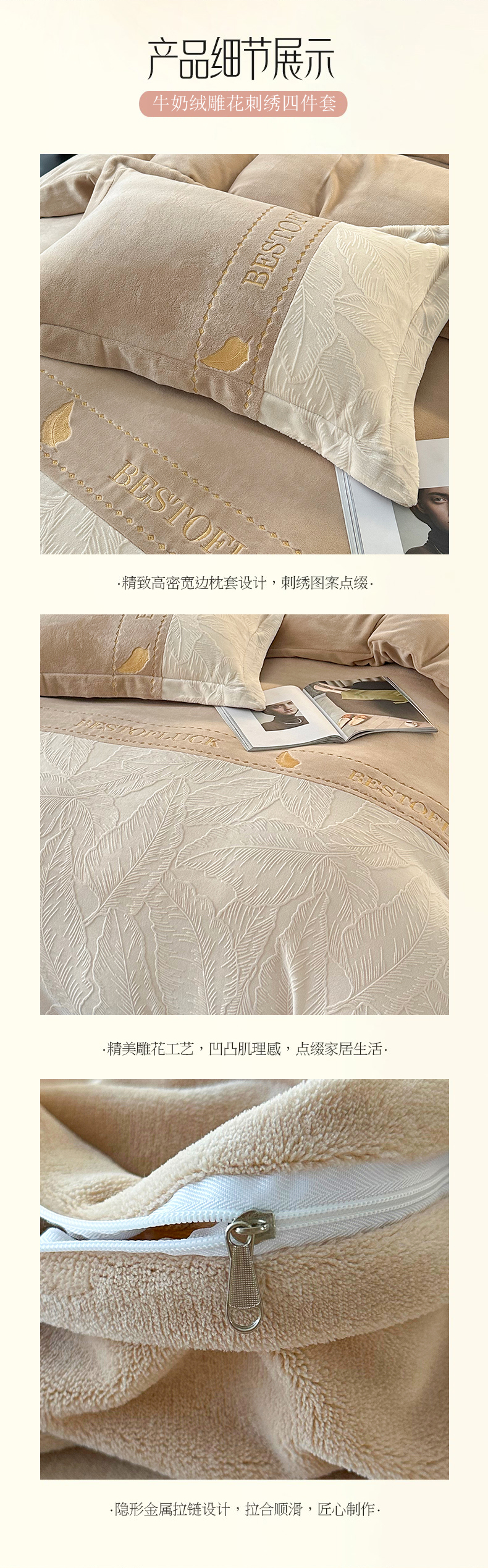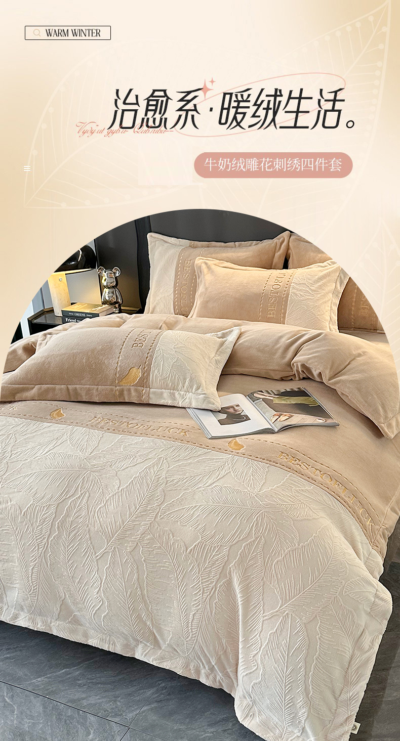 莱凯家纺 2025新款牛奶绒雕花刺绣四件套-叶屿 叶屿-咖