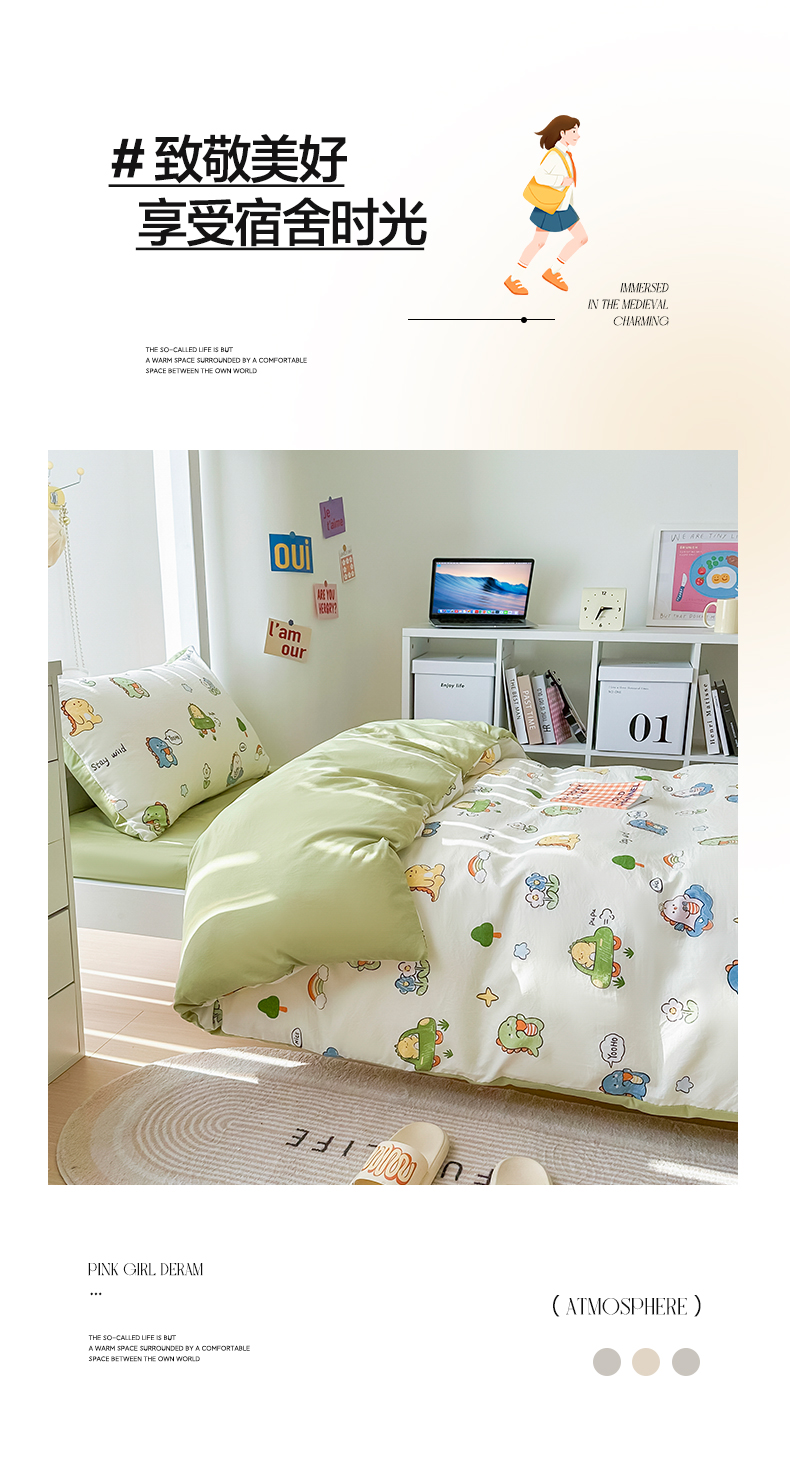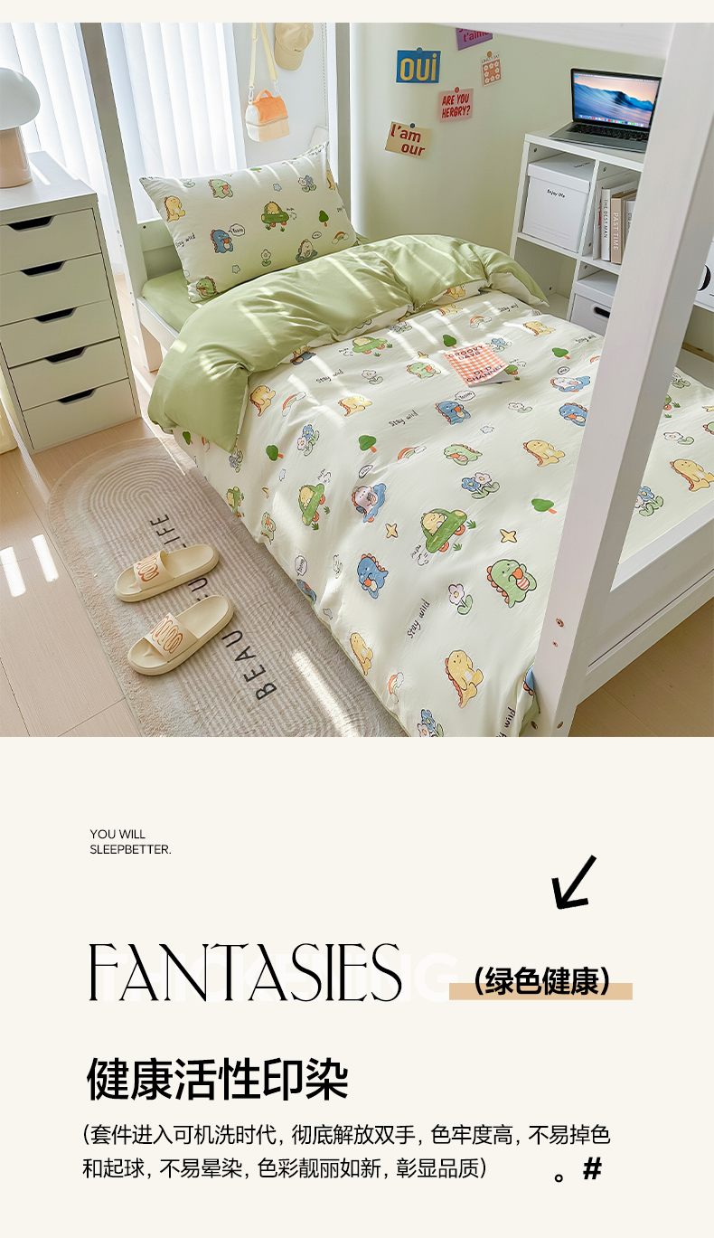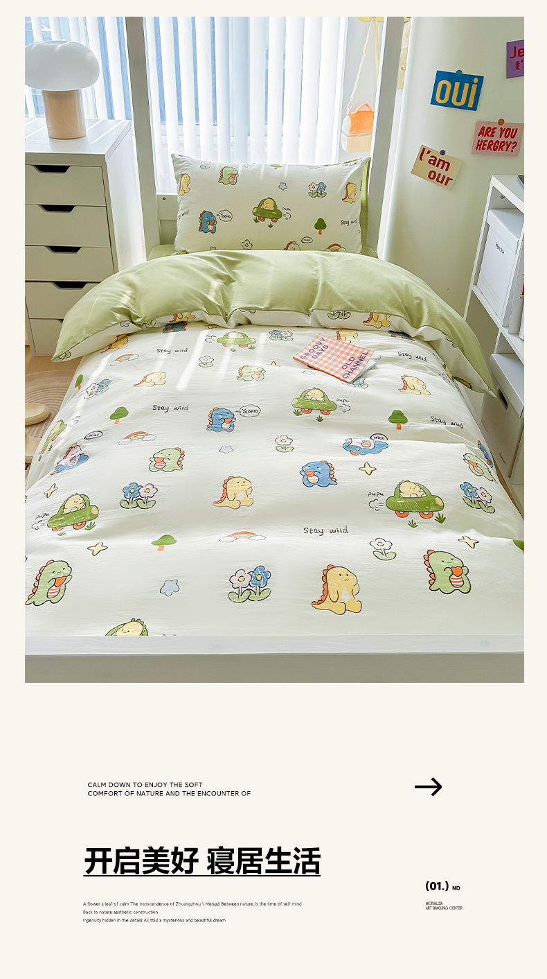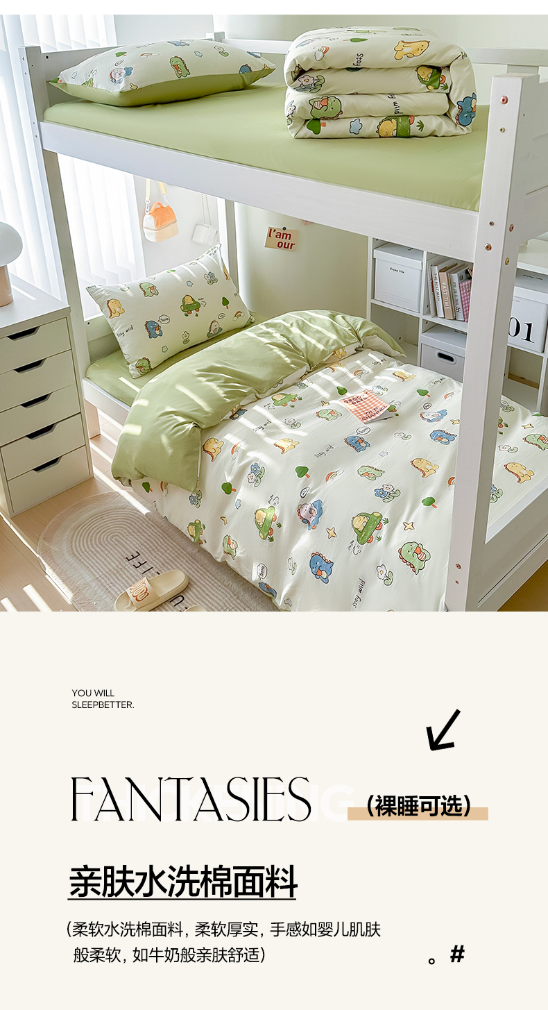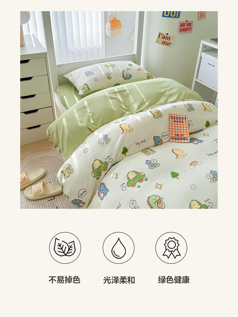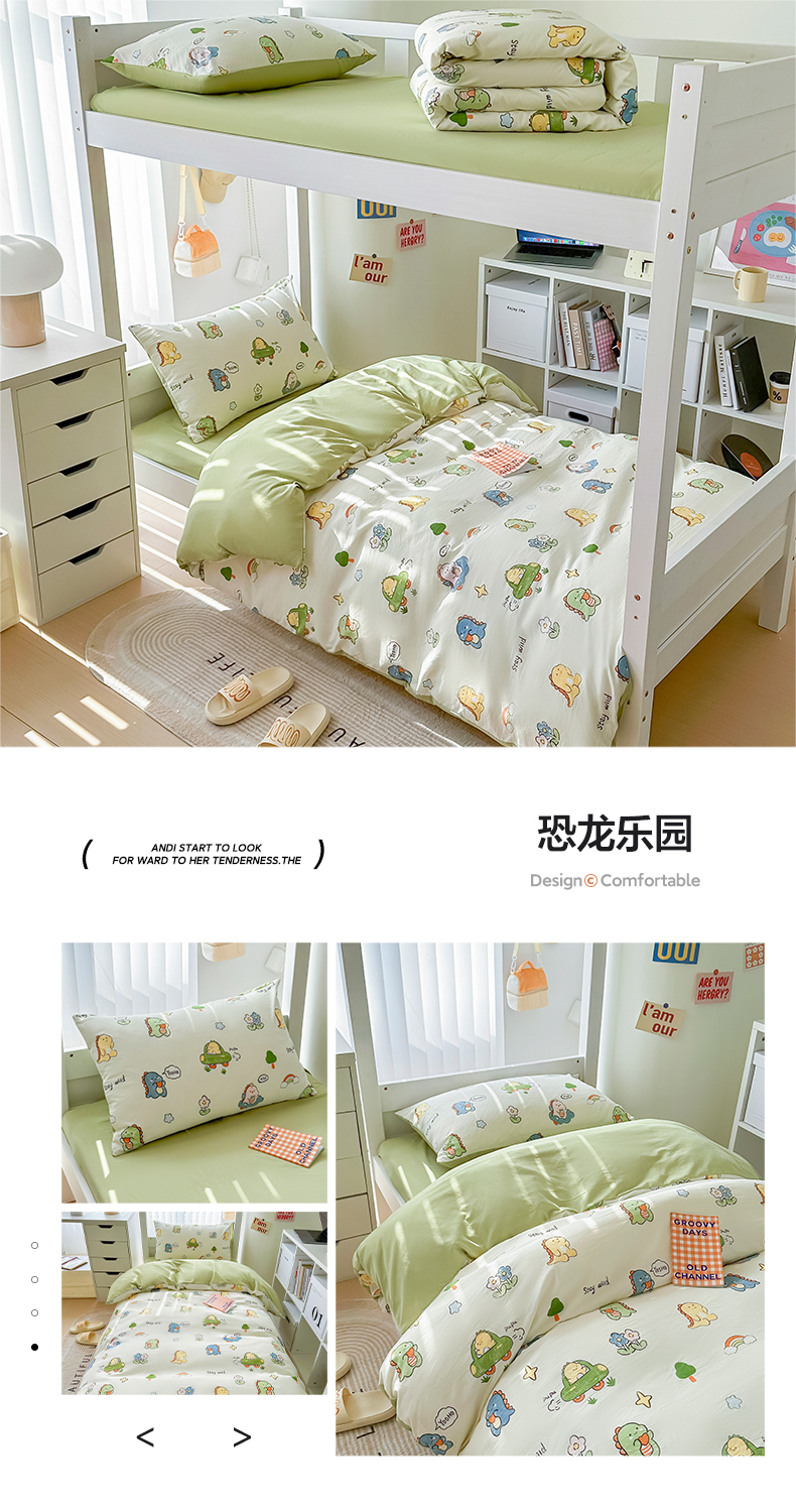 商品名称:2024新款水洗棉小清新印花学生三件套(床笠床套款) 恐龙乐园