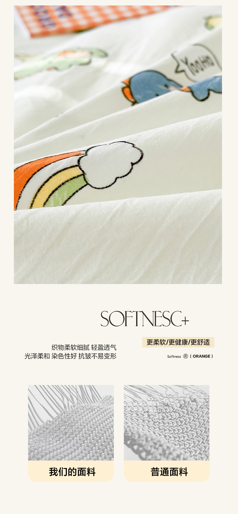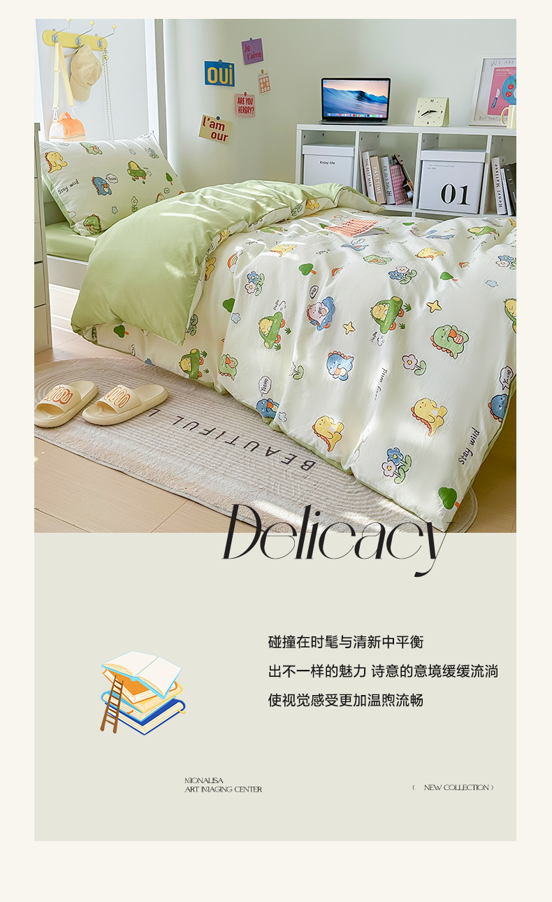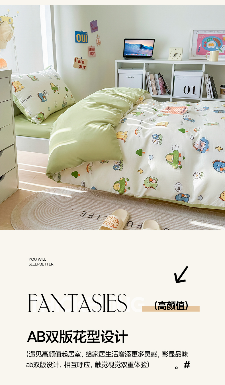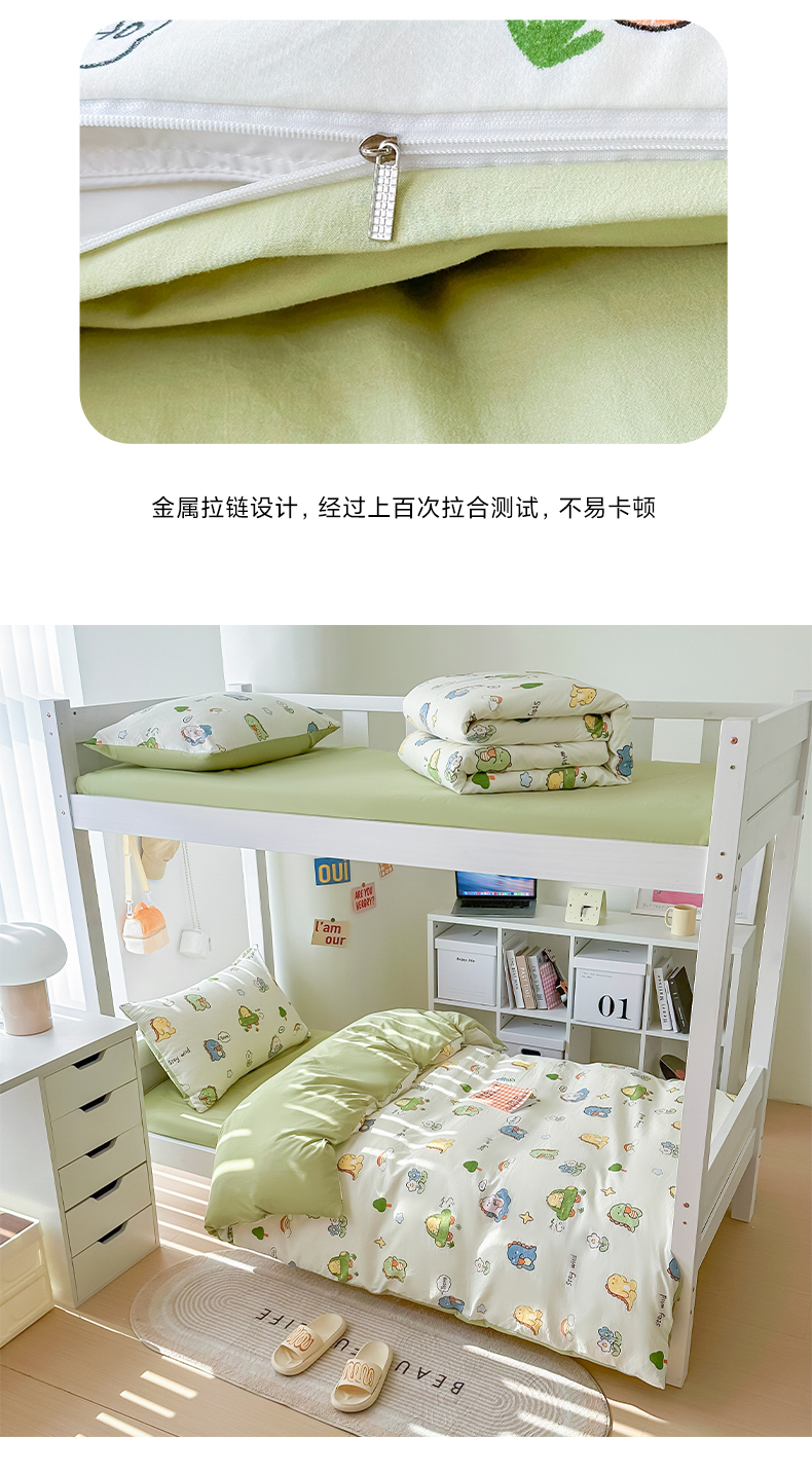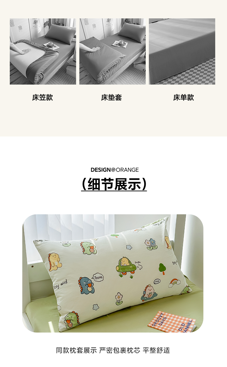 商品名称:2024新款水洗棉小清新印花学生三件套(床笠床套款) 恐龙乐园