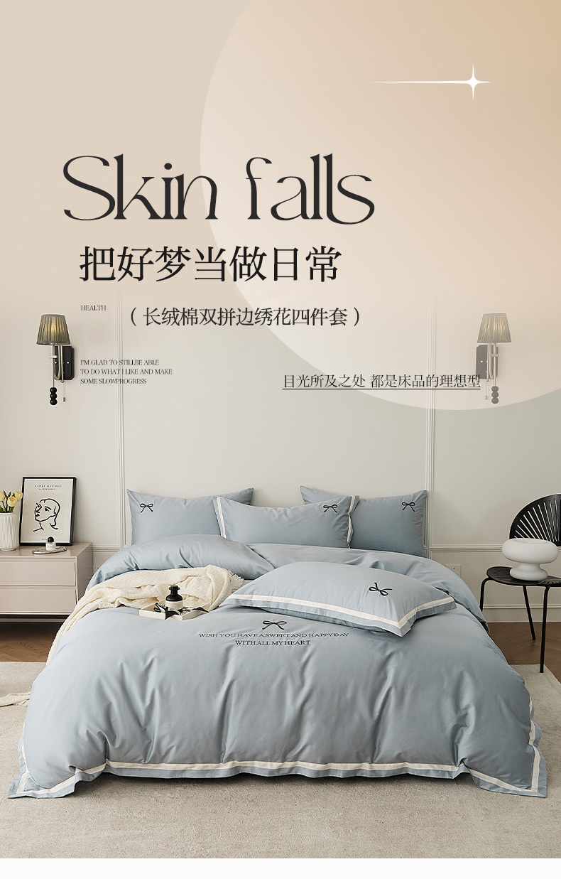 当前位置: 91家纺网 > 商品网购 > 床品套件 > 四件套 > 长绒棉四件套 > EH家居 2024新款长绒棉绣花四件套-伊人系列 伊人-月蓝
