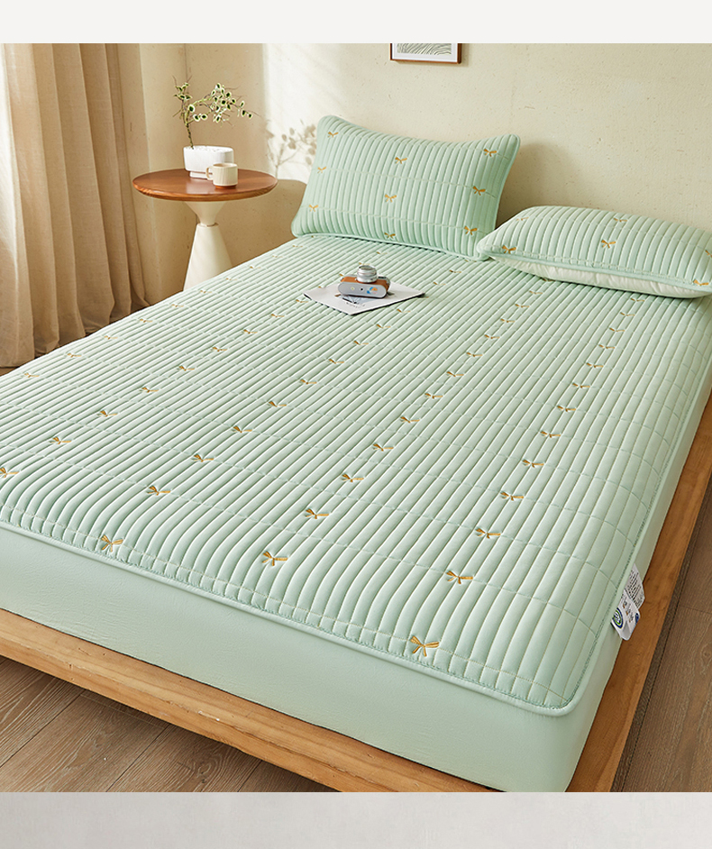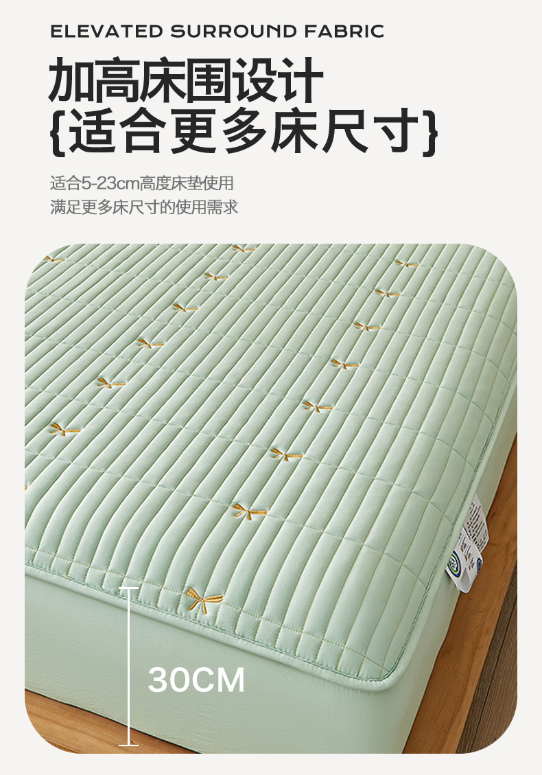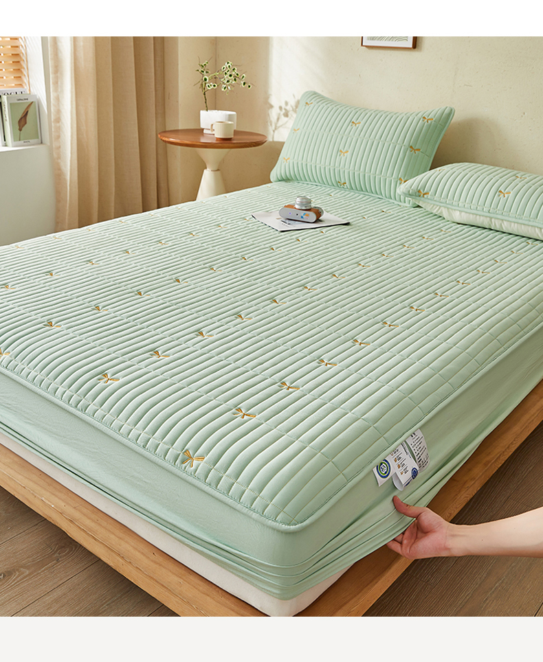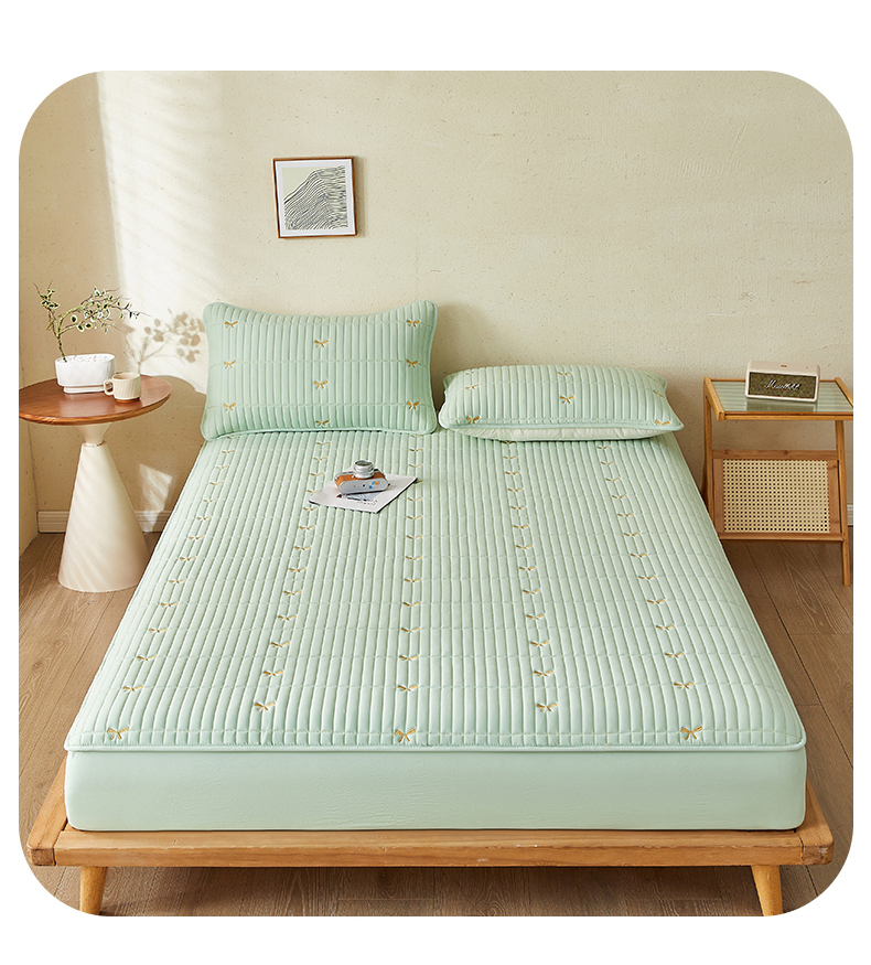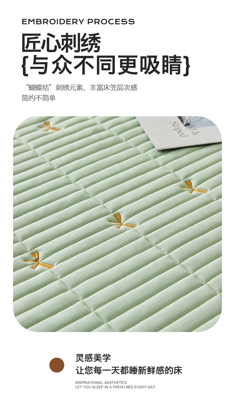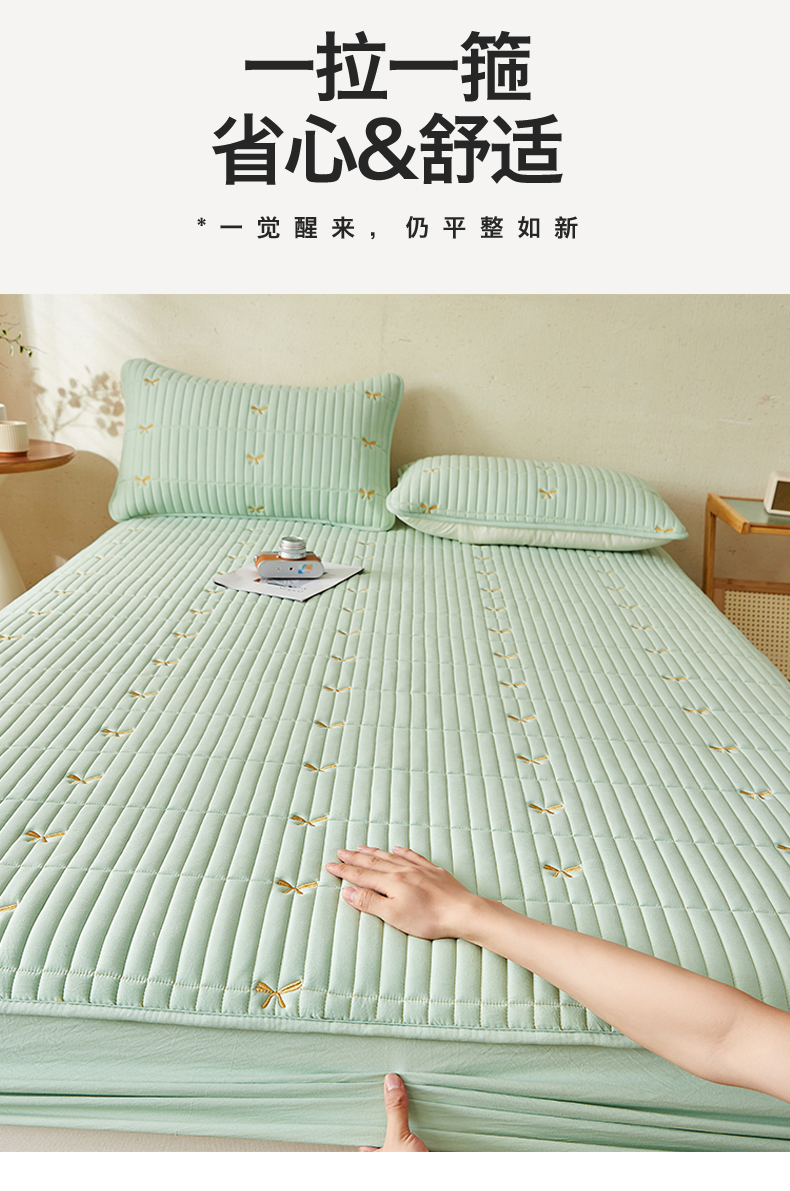 • 91家纺网 家纺一手货源 找家纺 叠派家纺 2024新款水洗棉刺绣夹棉床笠 蝴蝶结-果绿