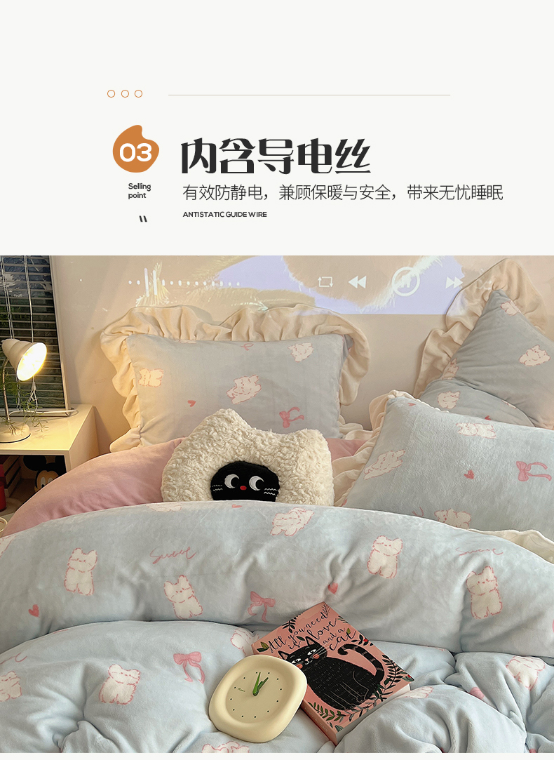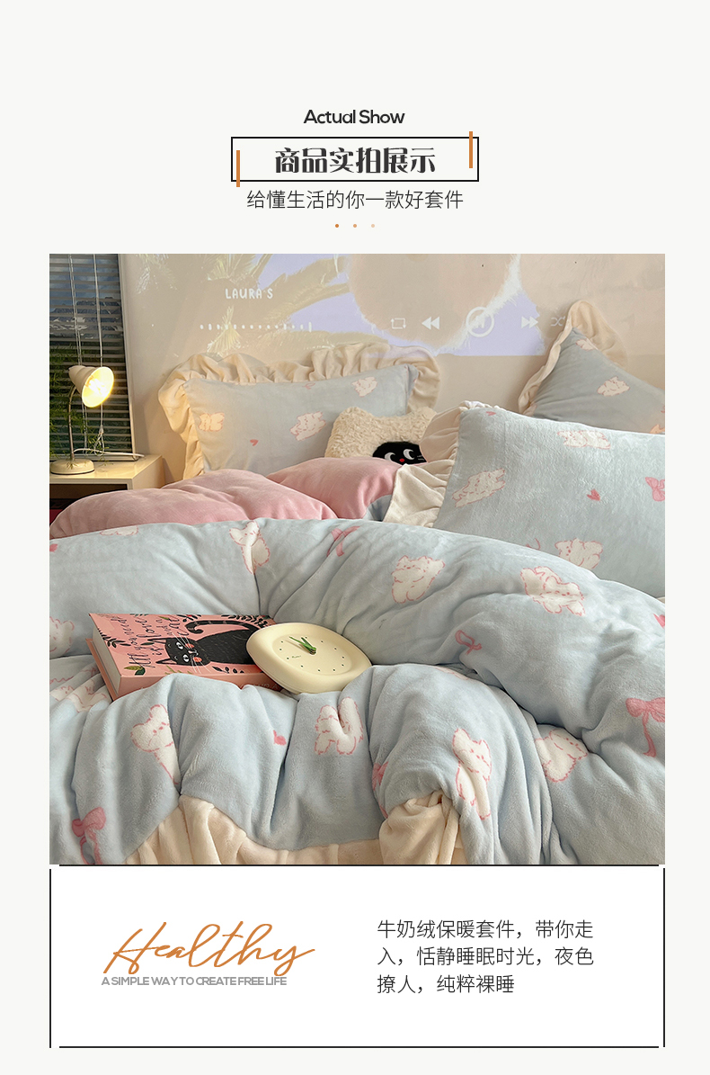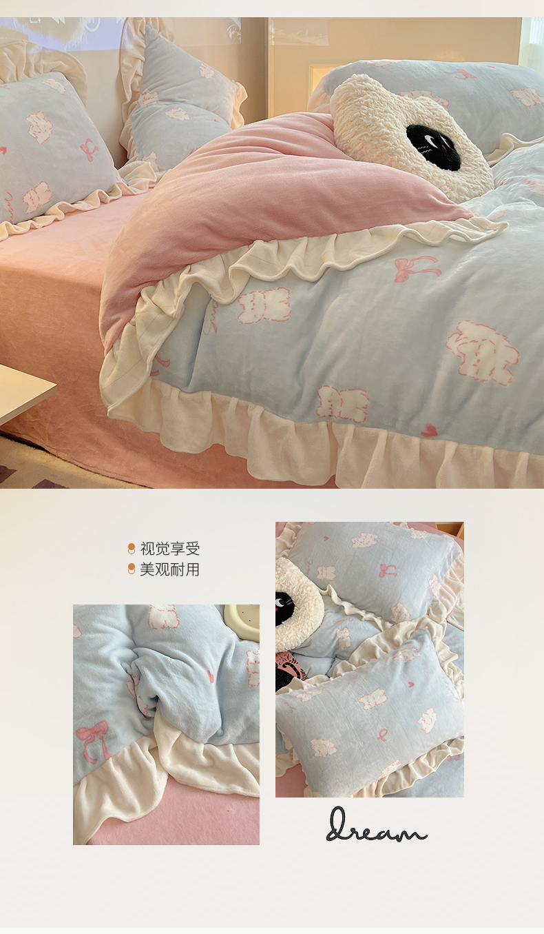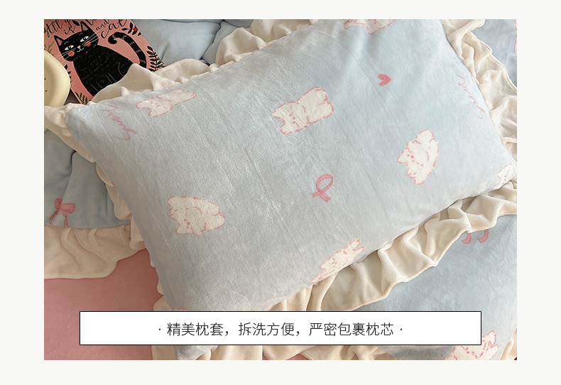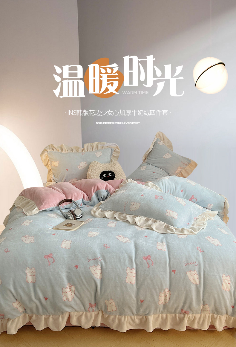 桃子家居 2024新款A类ins韩版花边少女心加厚牛奶绒四件套 绒-花边蓝粉猫咪