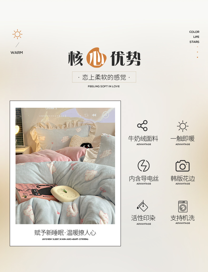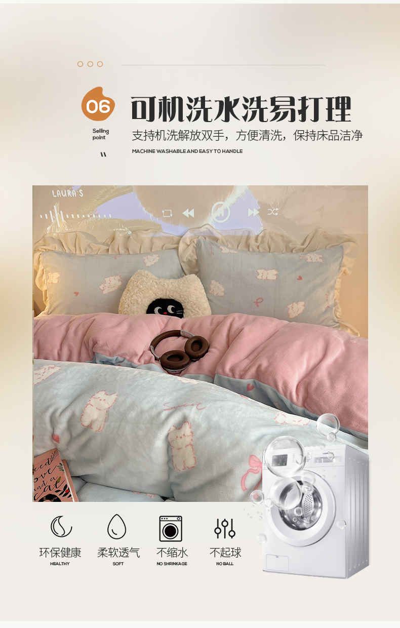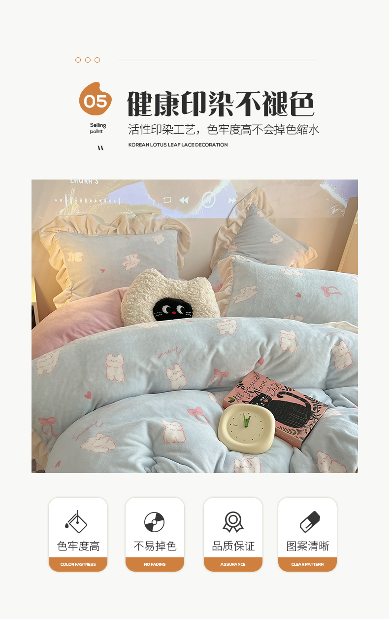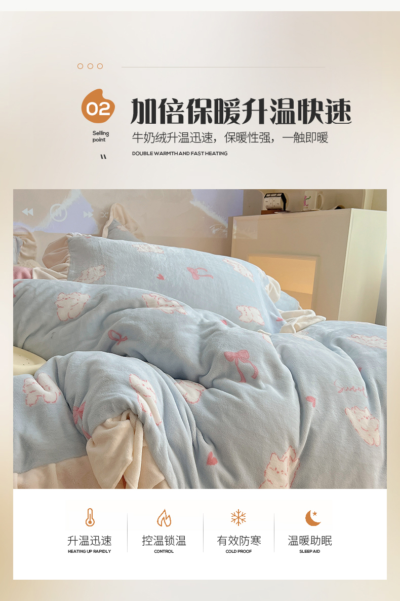 桃子家居 2024新款A类ins韩版花边少女心加厚牛奶绒四件套 绒-花边蓝粉猫咪