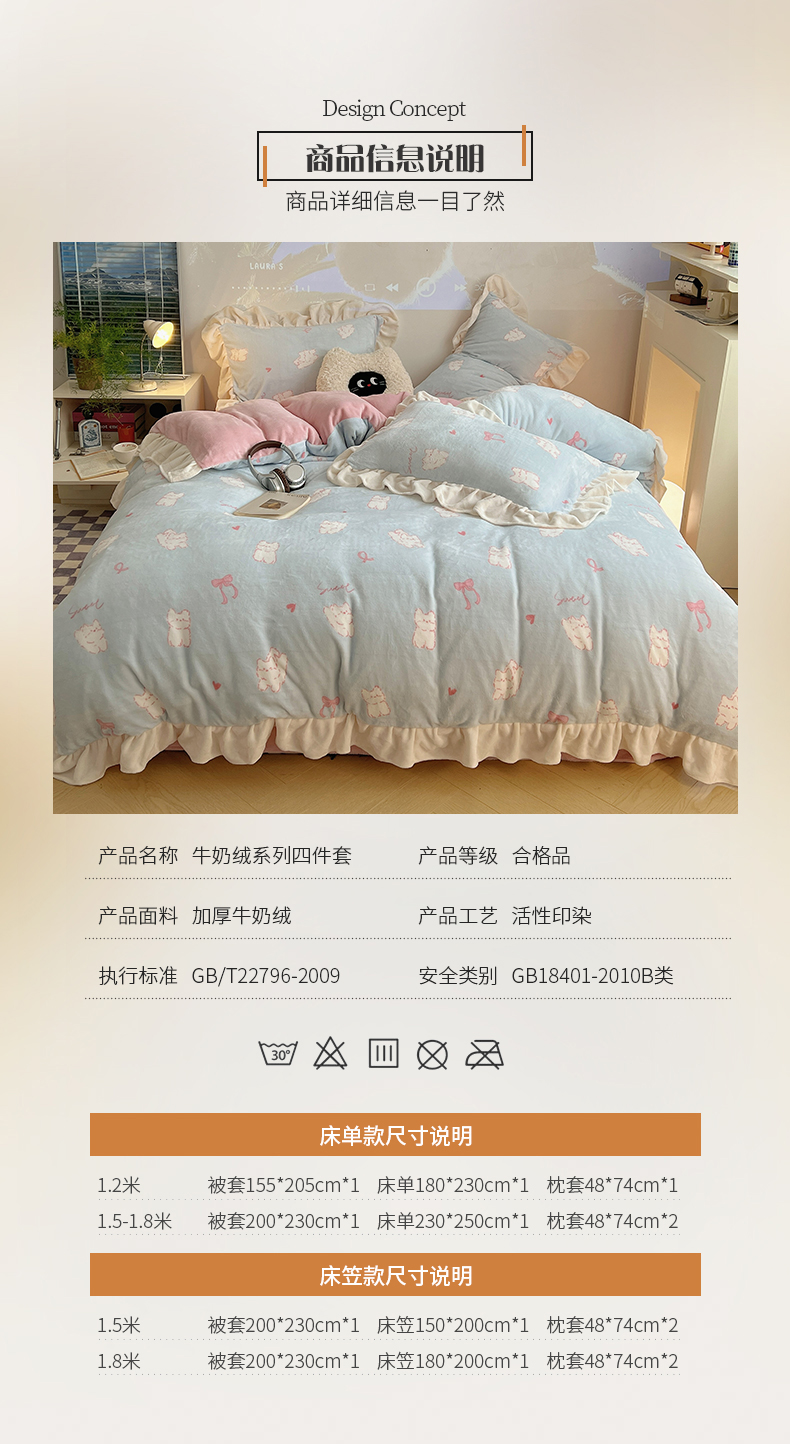 商品名称:桃子家居 2024新款A类ins韩版花边少女心加厚牛奶绒四件套 绒-花边蓝粉猫咪