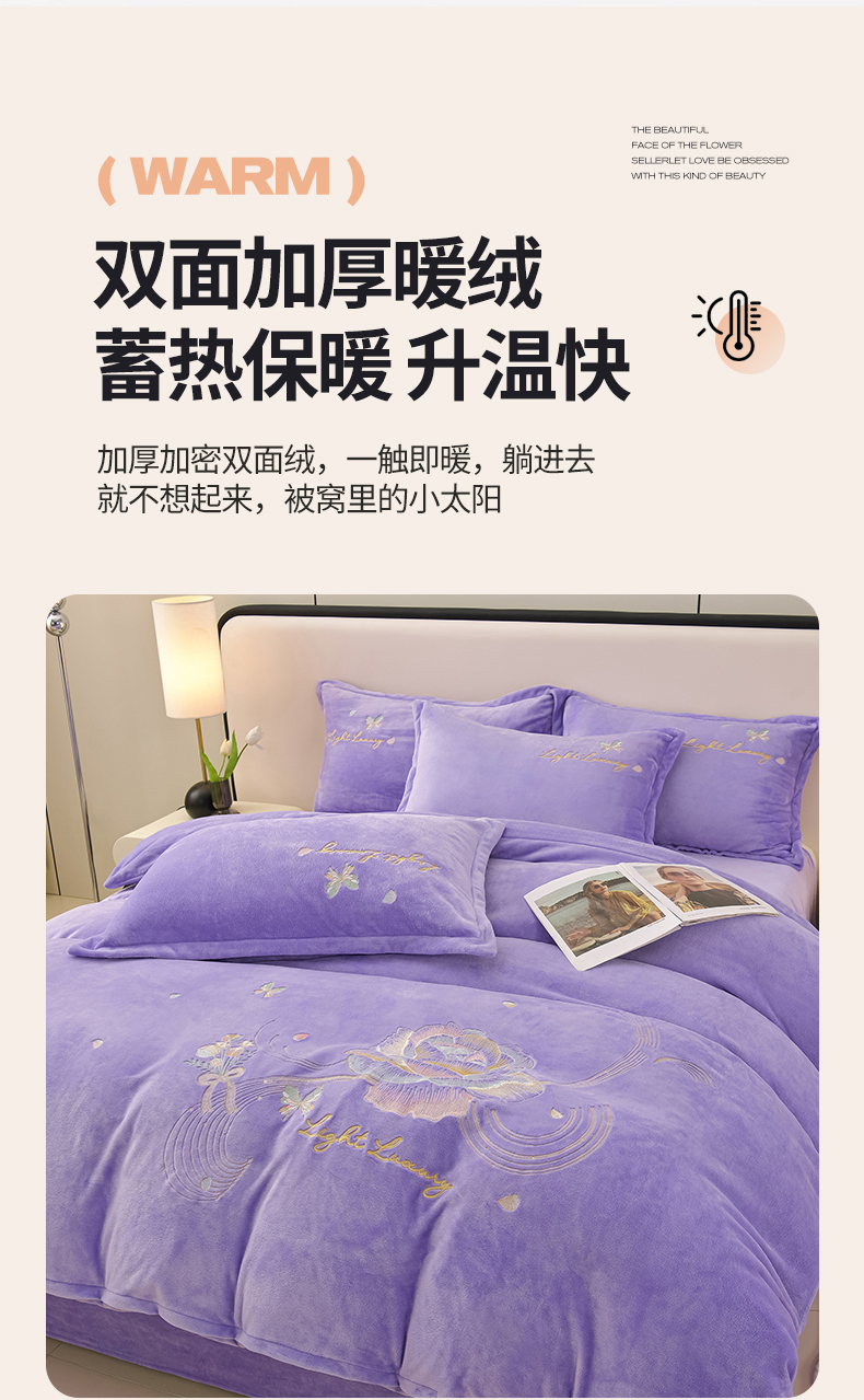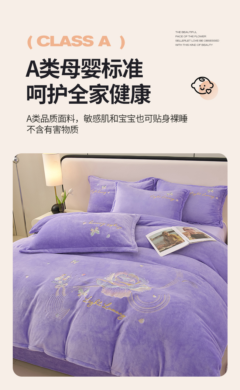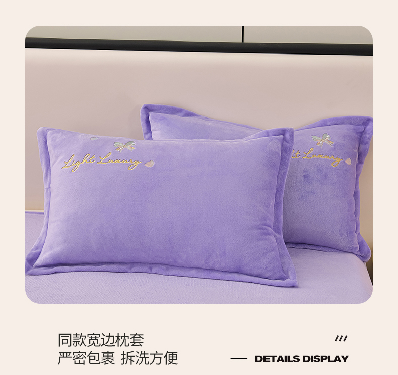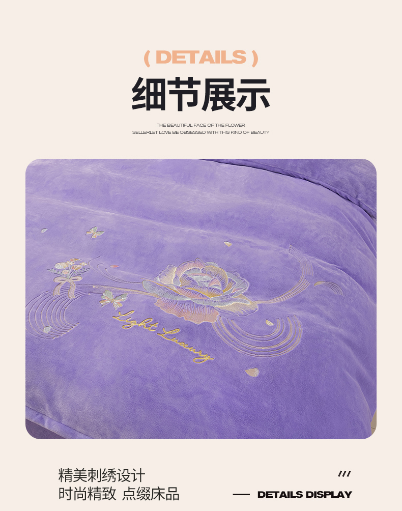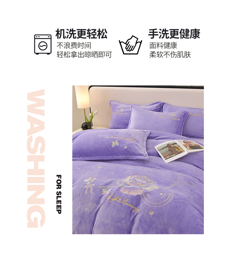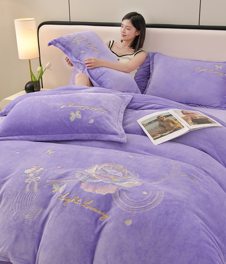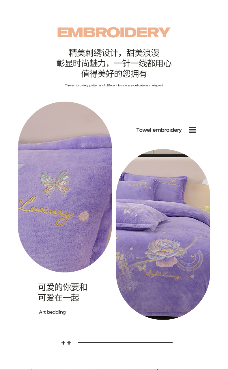 商品名称:绒小宣 2025新款高克重牛奶绒刺绣四件套 蝶恋花-浅夏紫