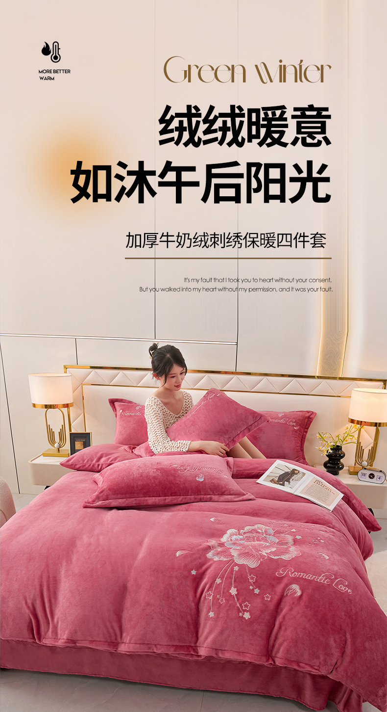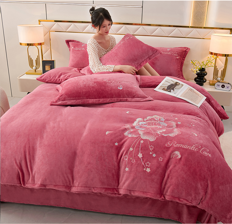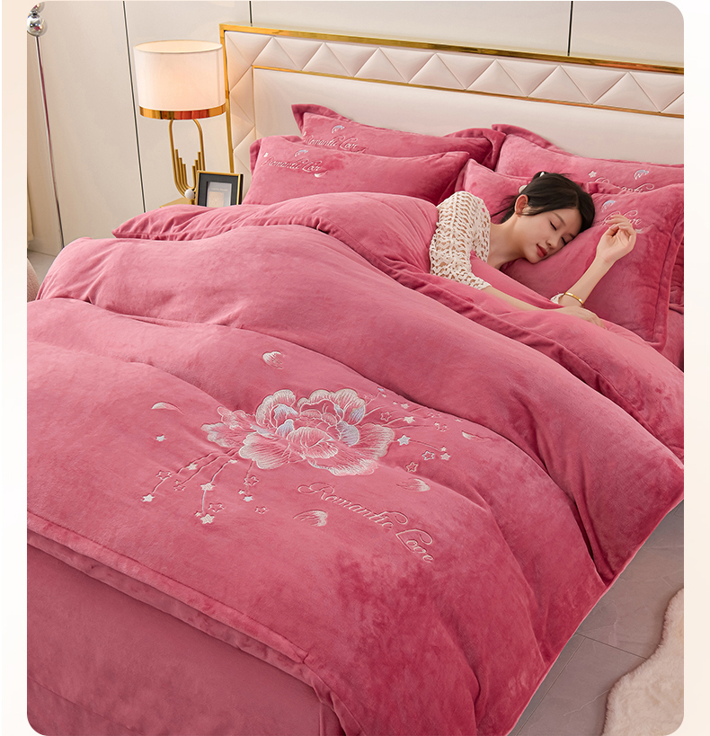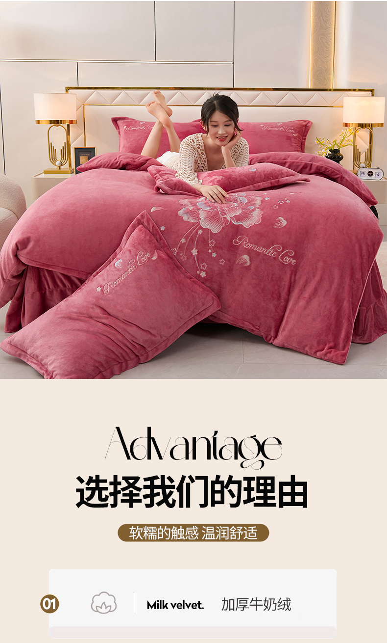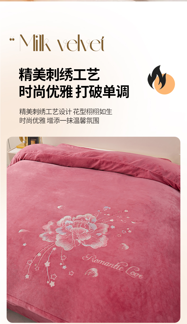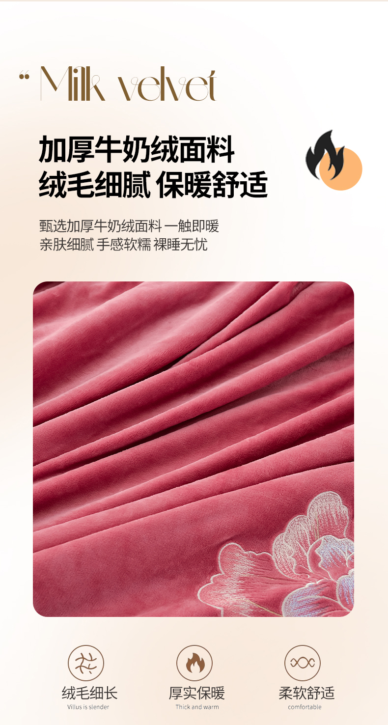 商品名称:绒小宣 2025新款高克重牛奶绒刺绣四件套 花开富贵-豆沙色