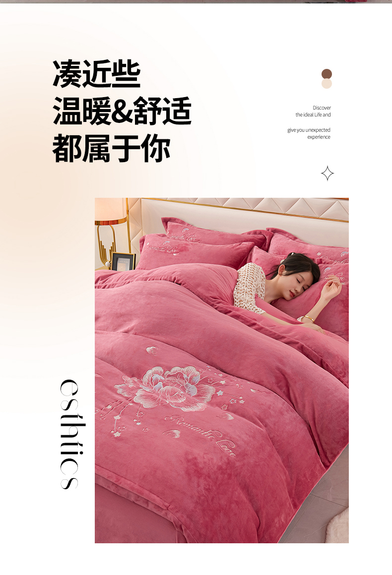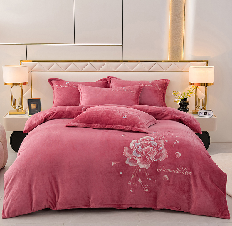 绒小宣 2025新款高克重牛奶绒刺绣四件套 花开富贵-粉,花开富贵-粉
