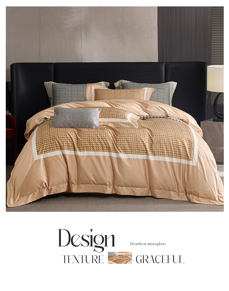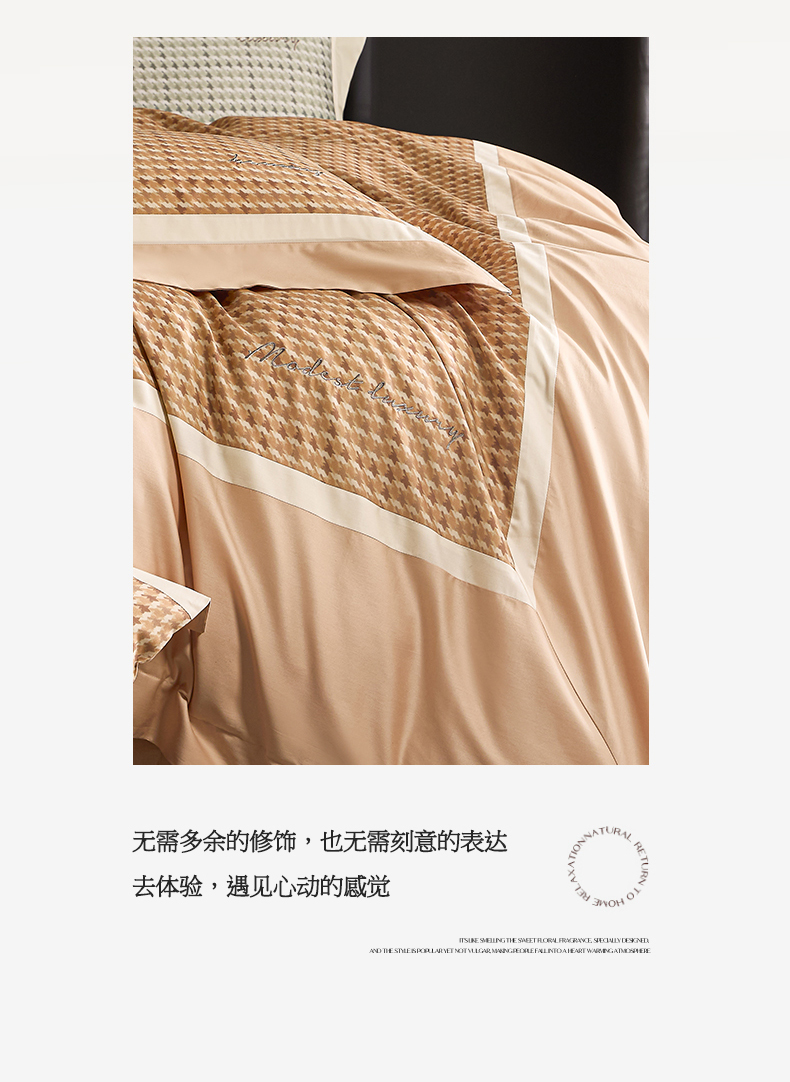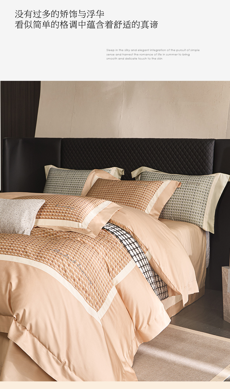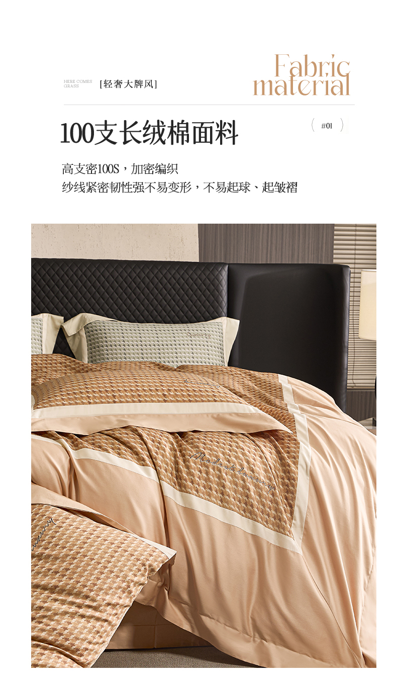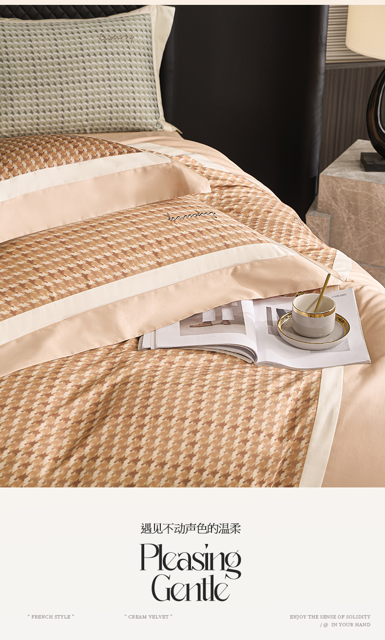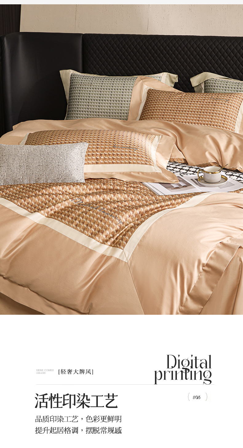商品名称:名品优仓 2024新款高支高密长绒棉数码印花加刺绣拼角款四件套-克鲁亚 克鲁亚-奶茶色