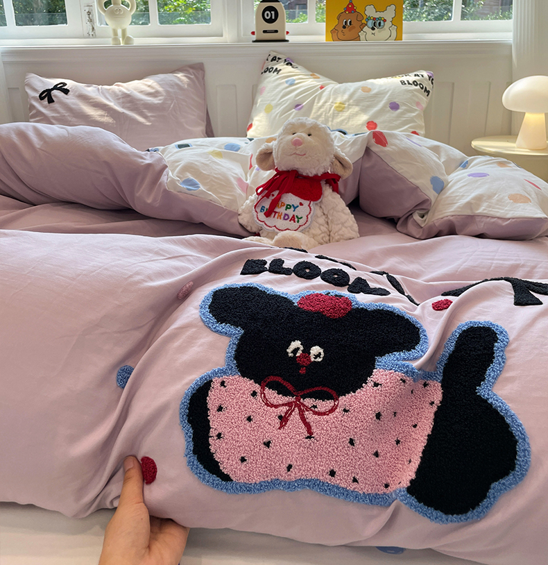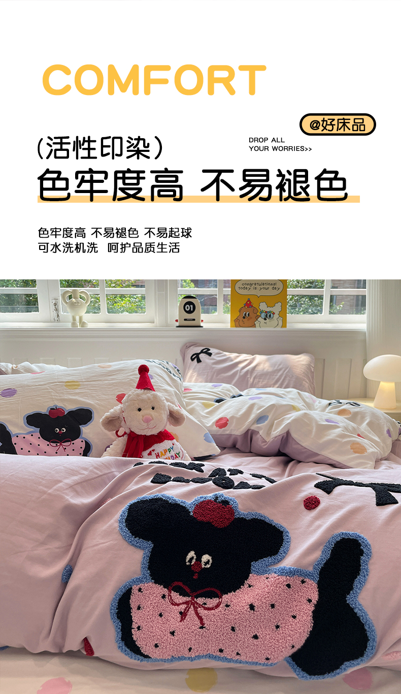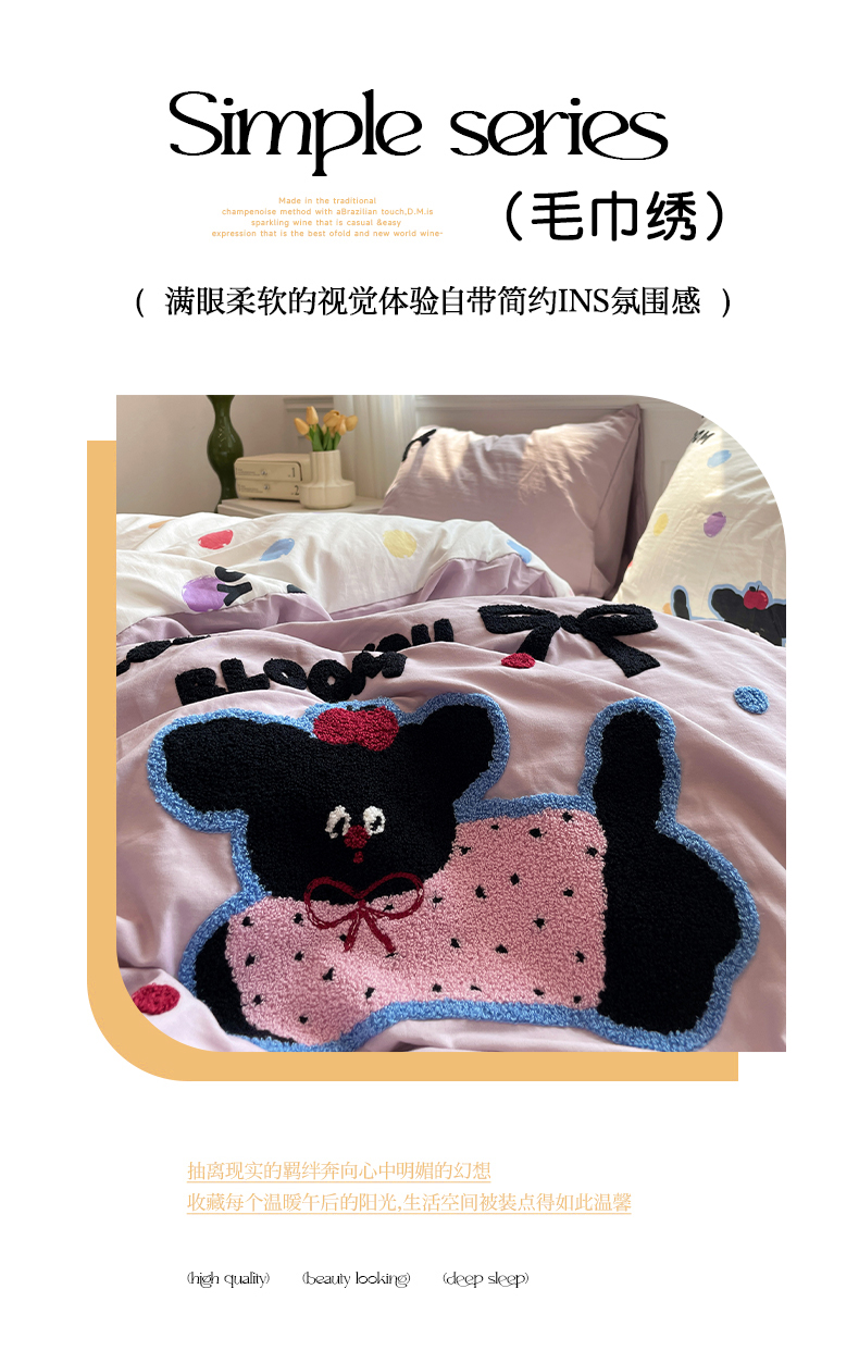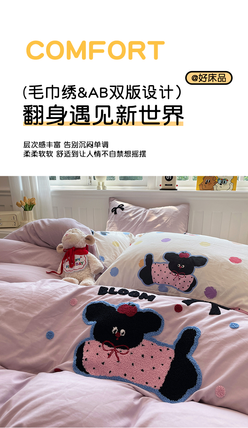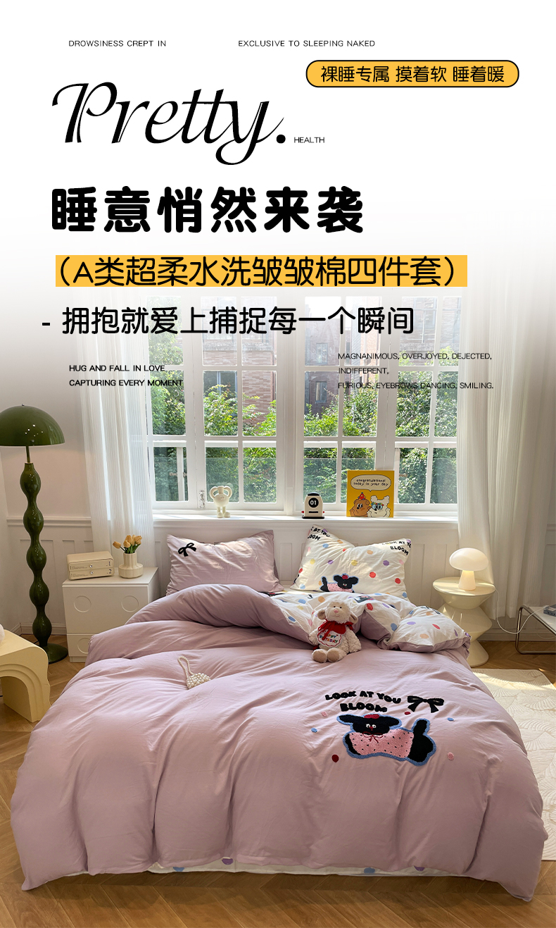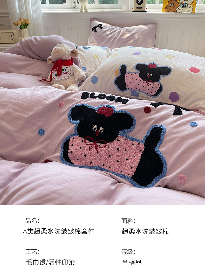 当前位置: 91家纺网 > 商品网购 > 床品套件 > 四件套 > 全棉普通四件套 > 奈颜 2024新款爆款超柔水洗皱皱棉四件套系列 苹果狗狗-浅紫
