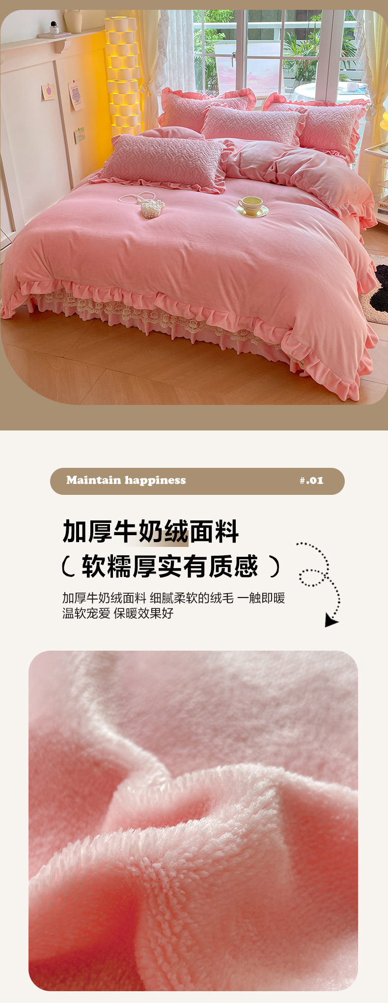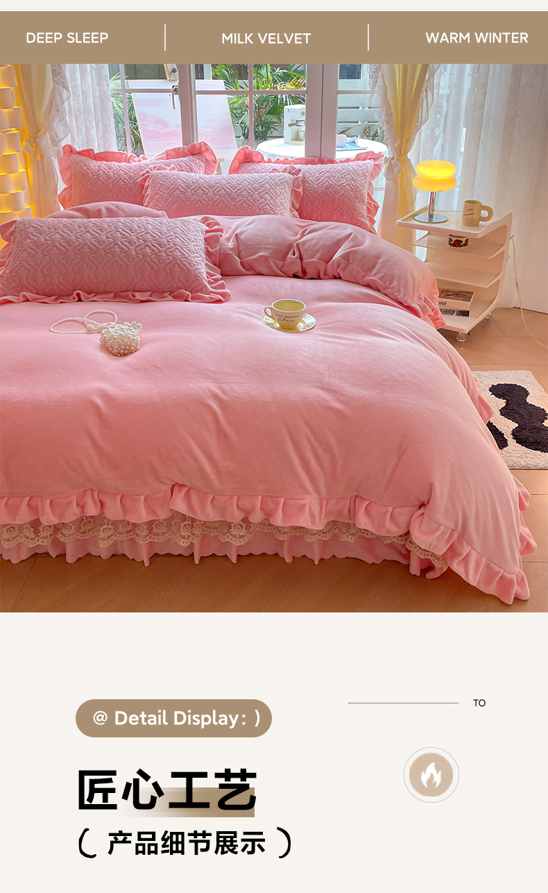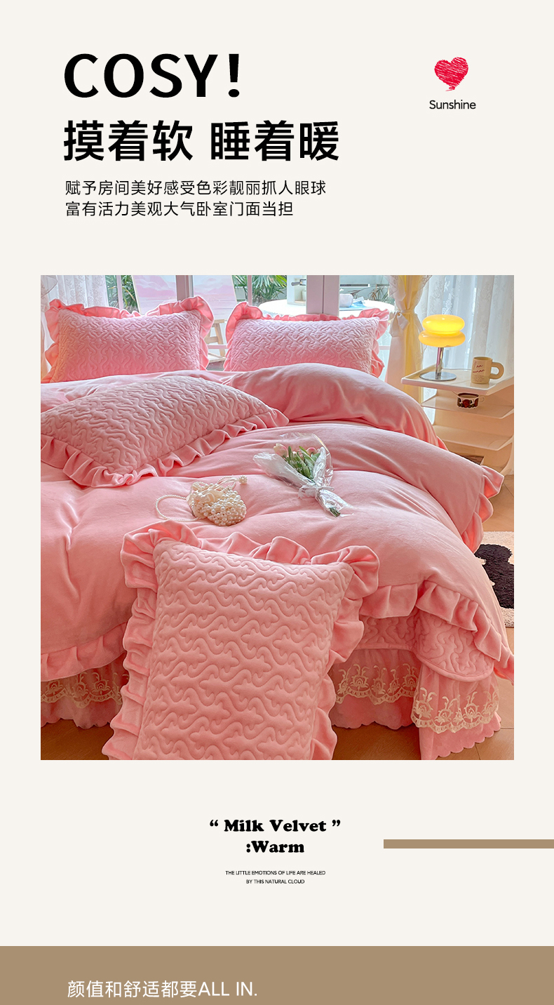 商品名称:畅畅家纺 2024新款冬季韩版花边蕾丝牛奶绒床盖四件套 粉色