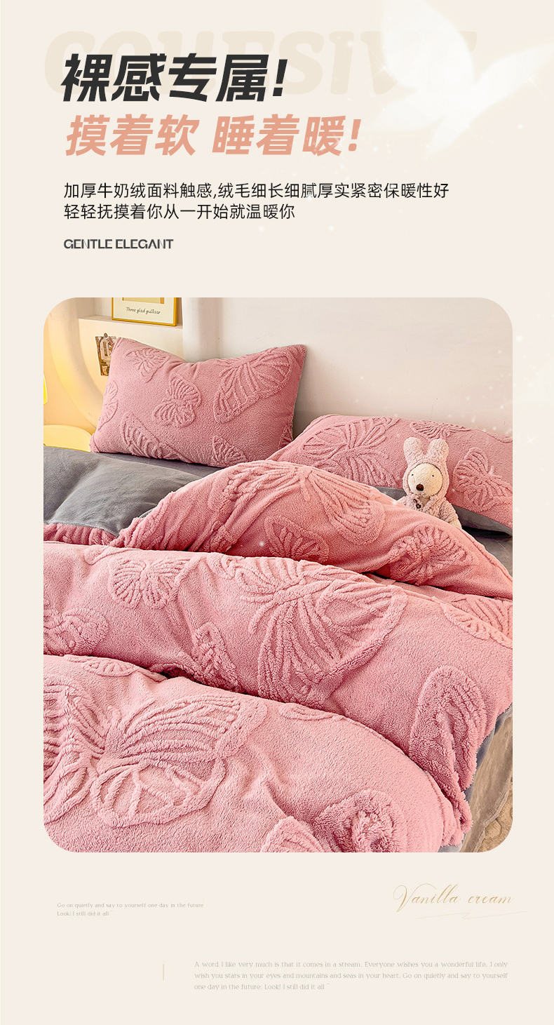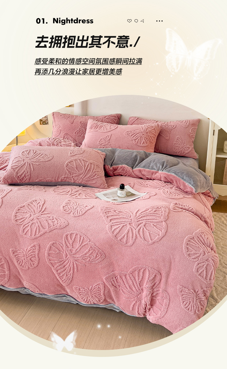 当前位置: 91家纺网 > 商品网购 > 床品套件 > 四件套 > 牛奶绒四件套 > 梦之岛 2024新款高克重提花雕花牛奶绒四件套 蝴蝶公主-豆沙
