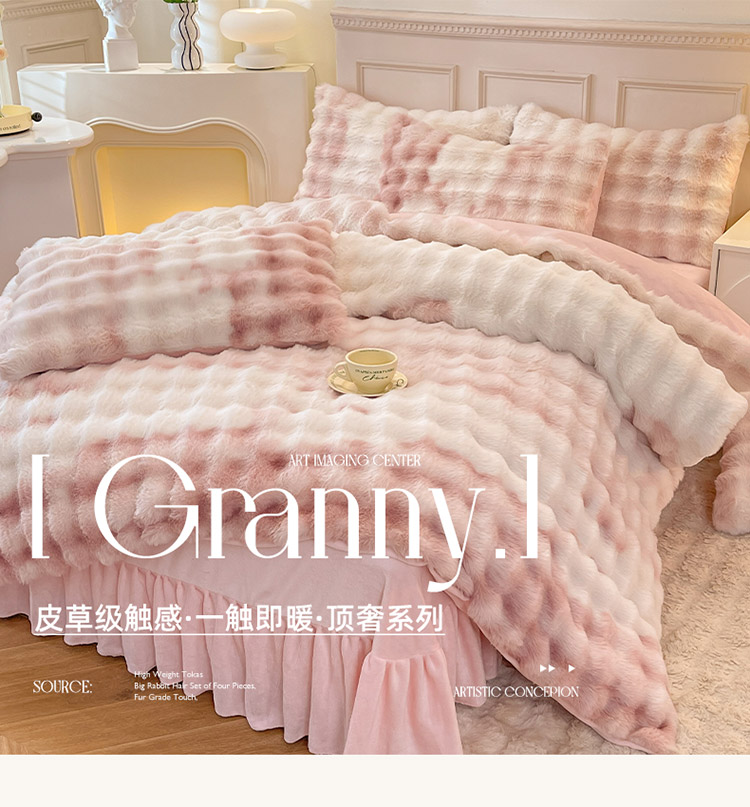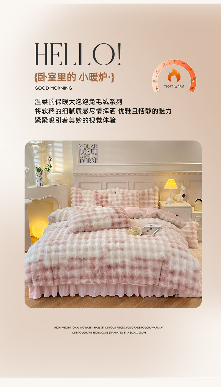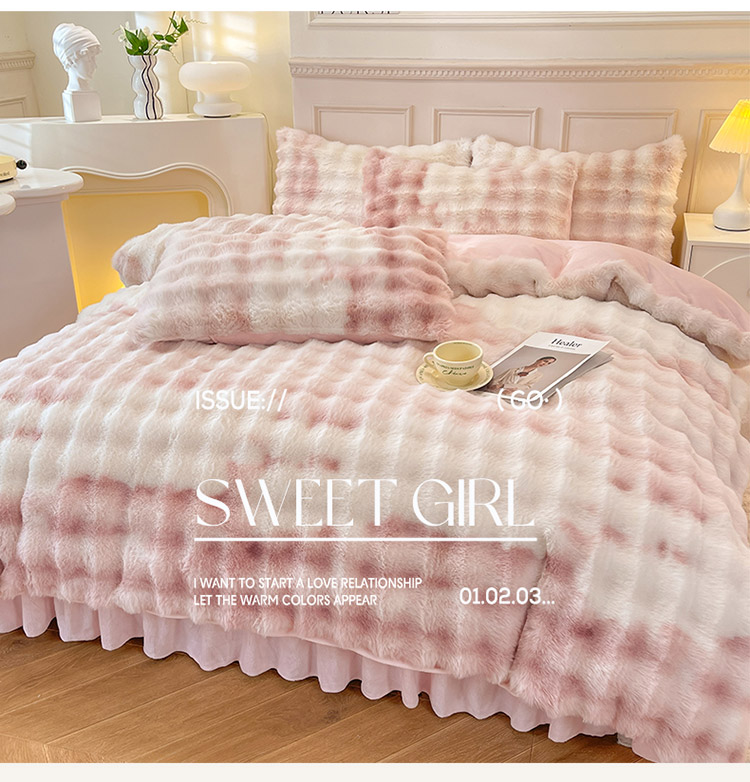 商品名称:丝印良品 2024直播秋冬高克重500克床裙款泡泡四件套纯色印花七彩-少女粉