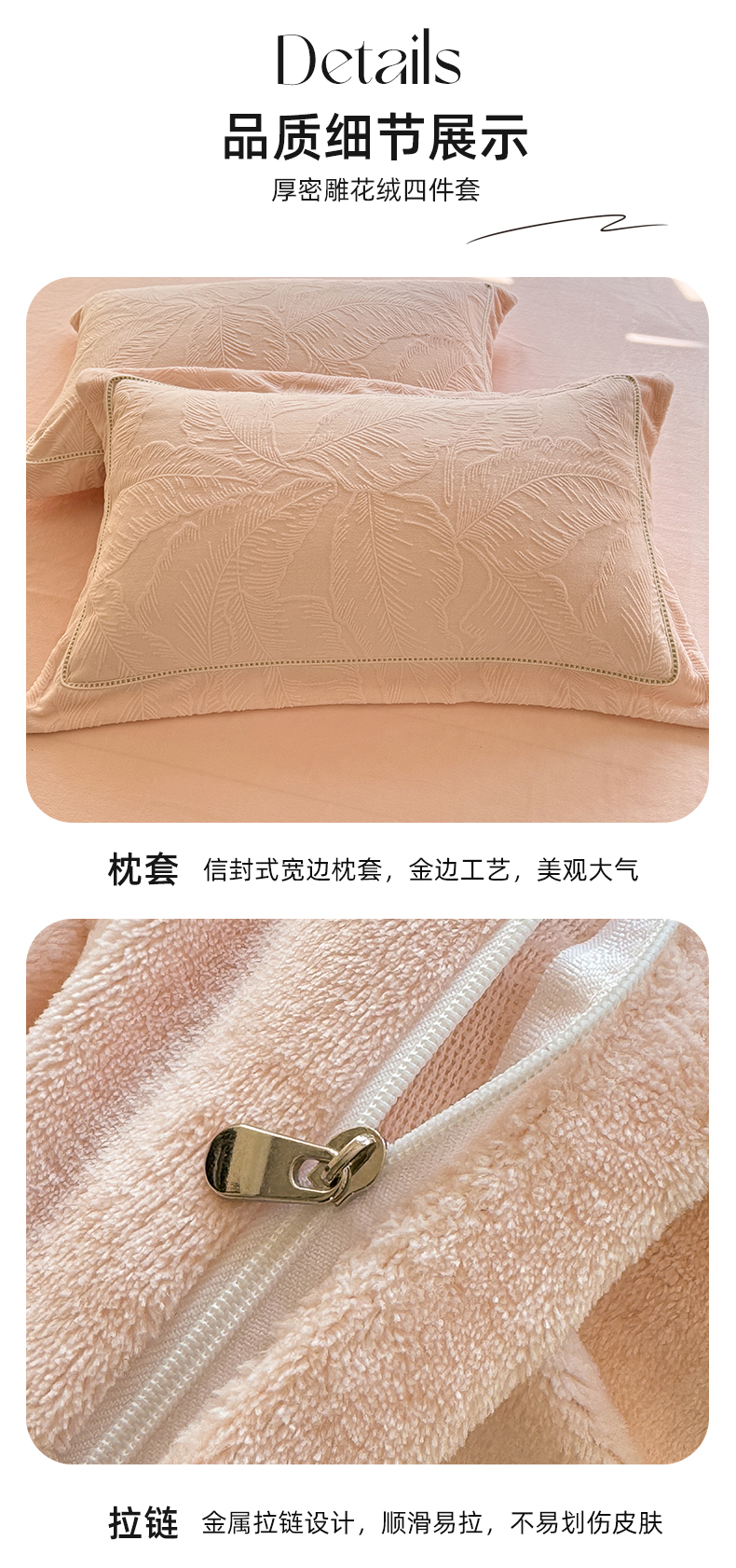 商品名称:艾唯希家纺 2024新款纯雕A类230克全消光雕花绒四件套牛奶绒6D高克重珊瑚绒宝宝绒 花之蔓-粉