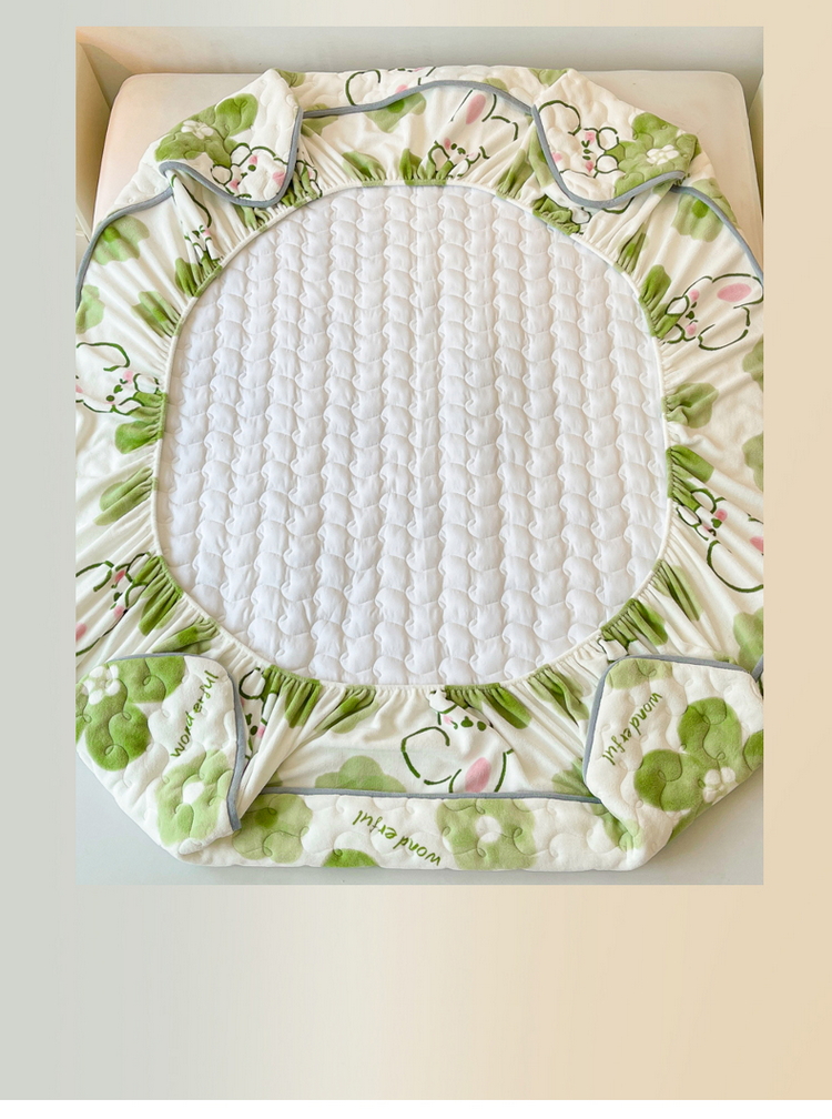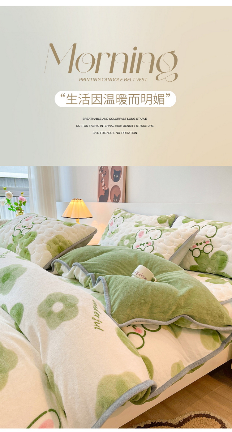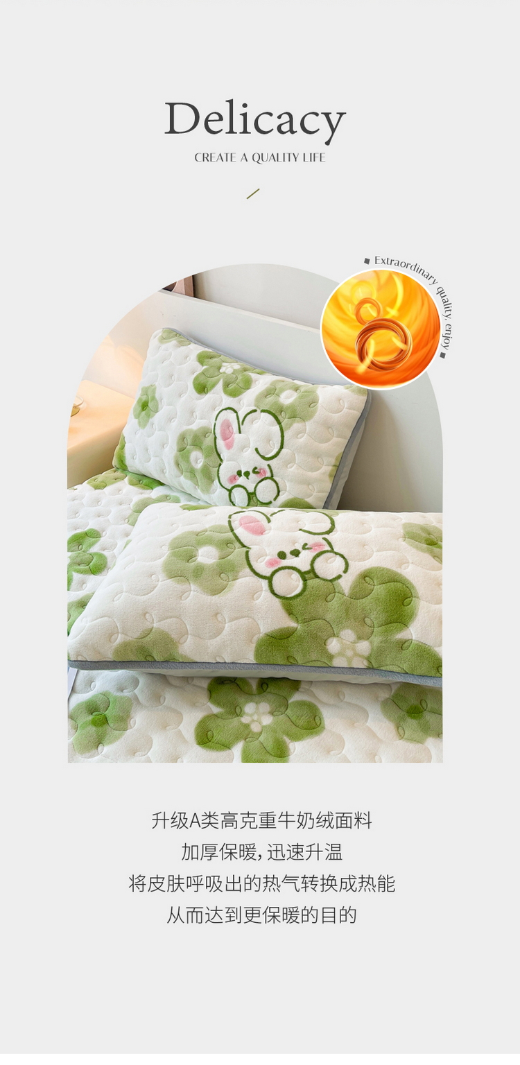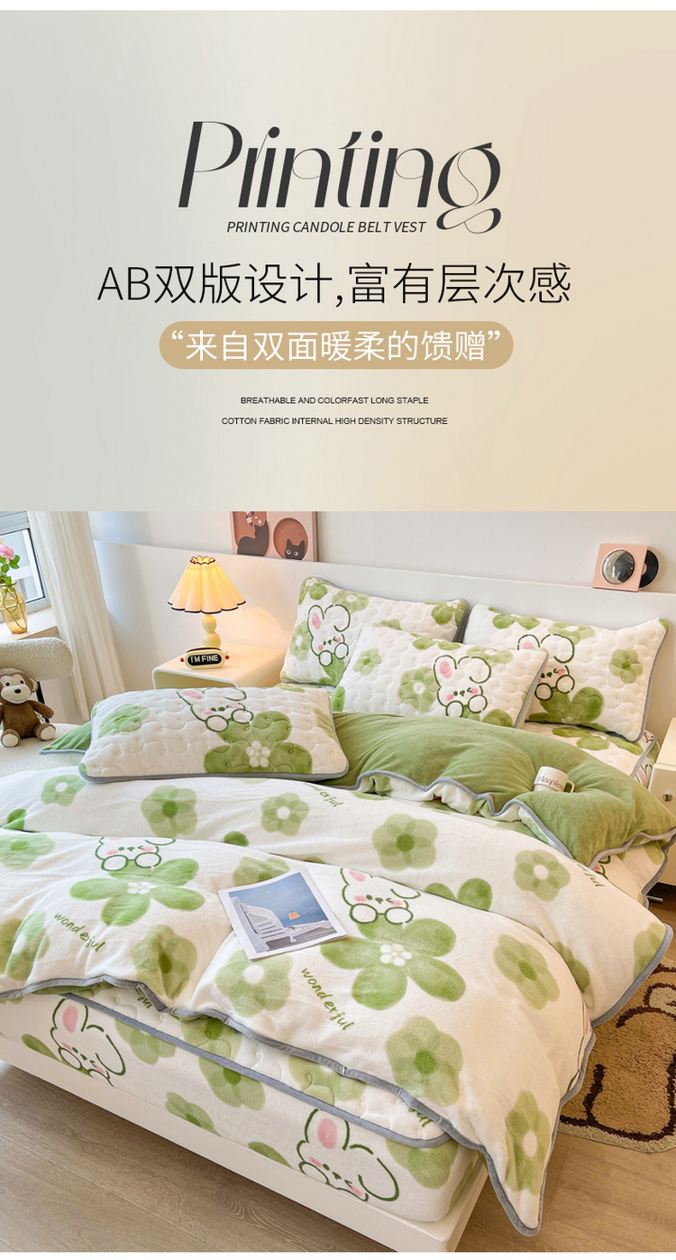 2024秋冬A类牛奶绒加厚夹棉床笠+牛奶绒被套四件套蓓蕾兔-绿