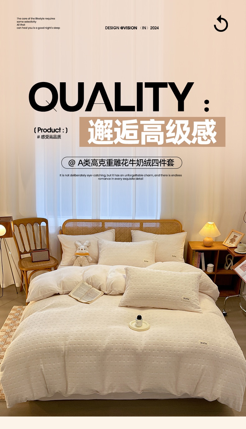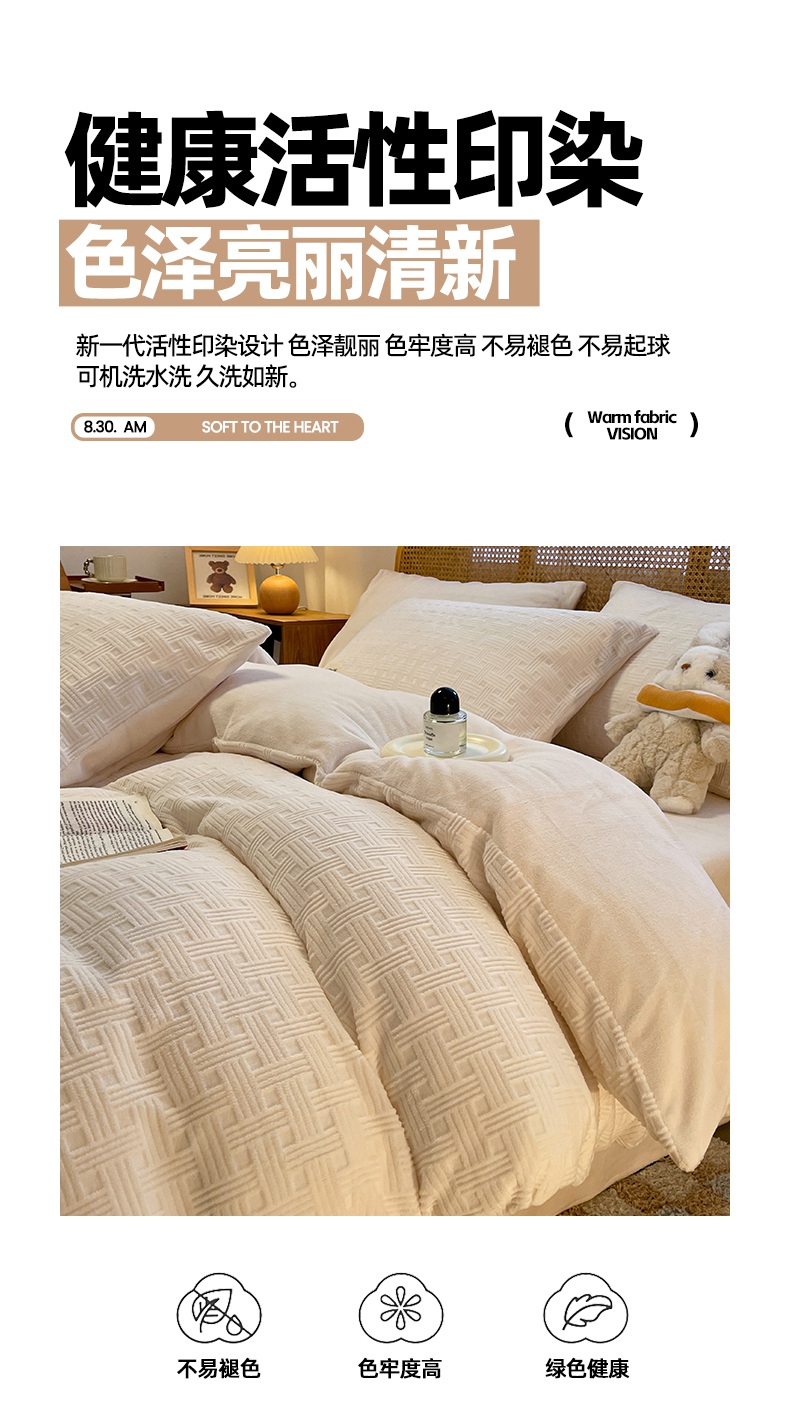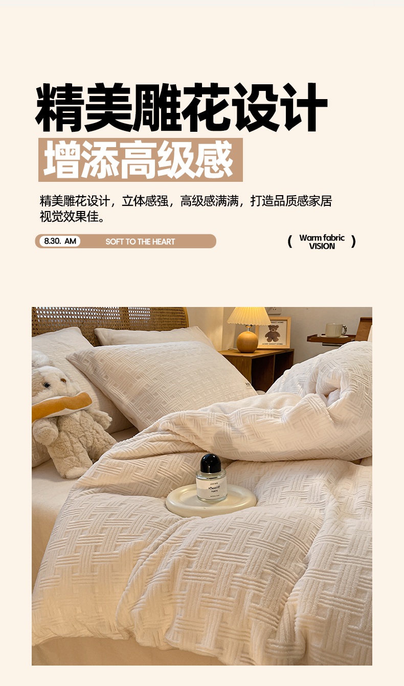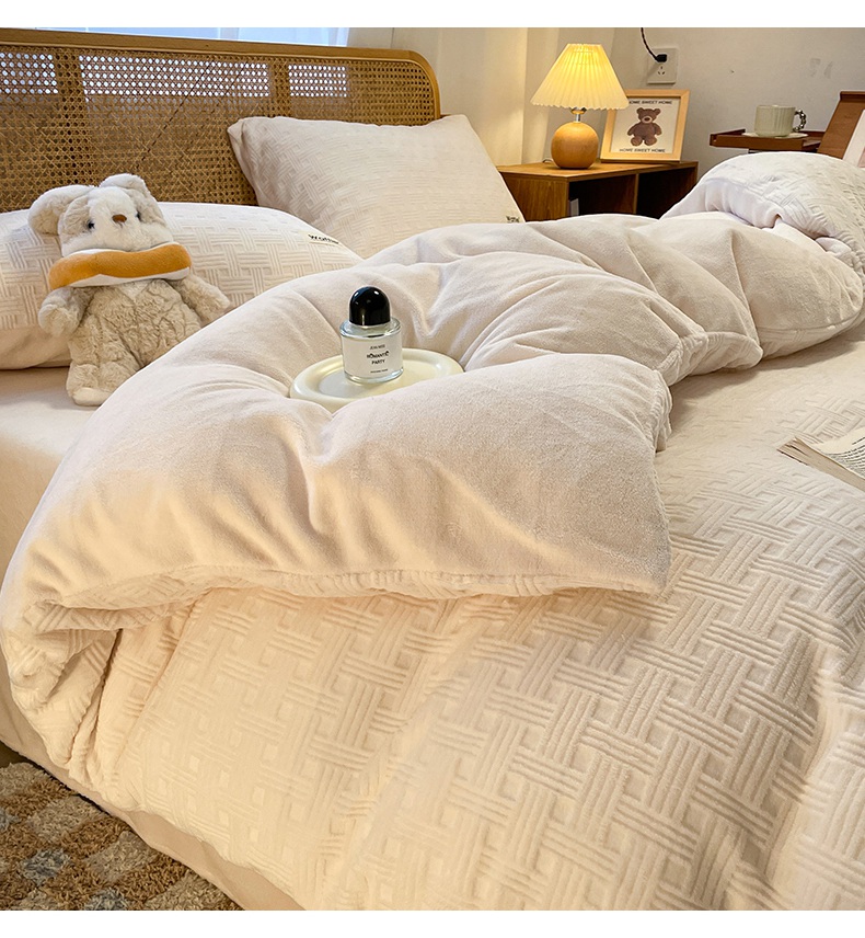 当前位置: 91家纺网 > 商品网购 > 床品套件 > 四件套 > 牛奶绒四件套 > 莱茵家居 2024新款A类高克重雕花牛奶绒四件套-糖果格 糖果格-米白