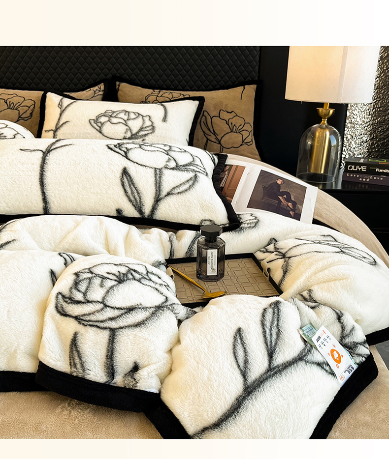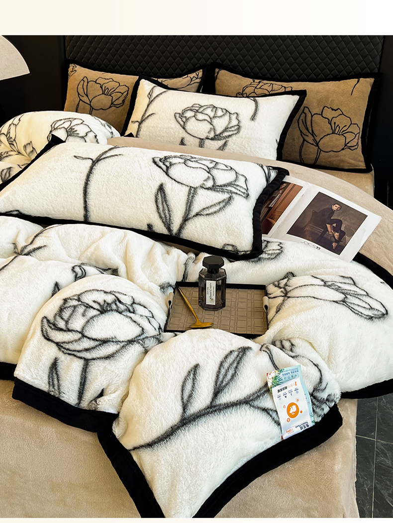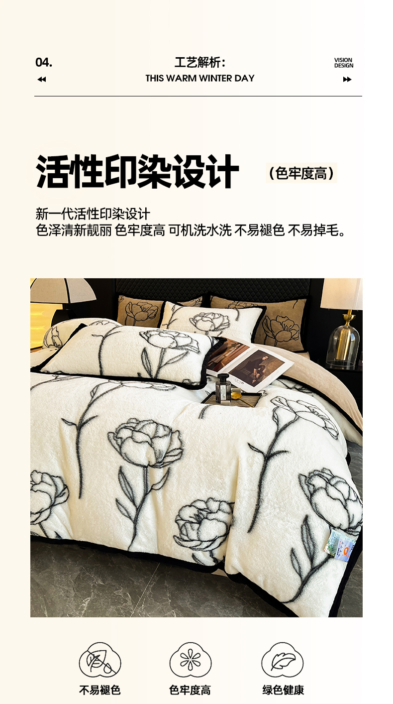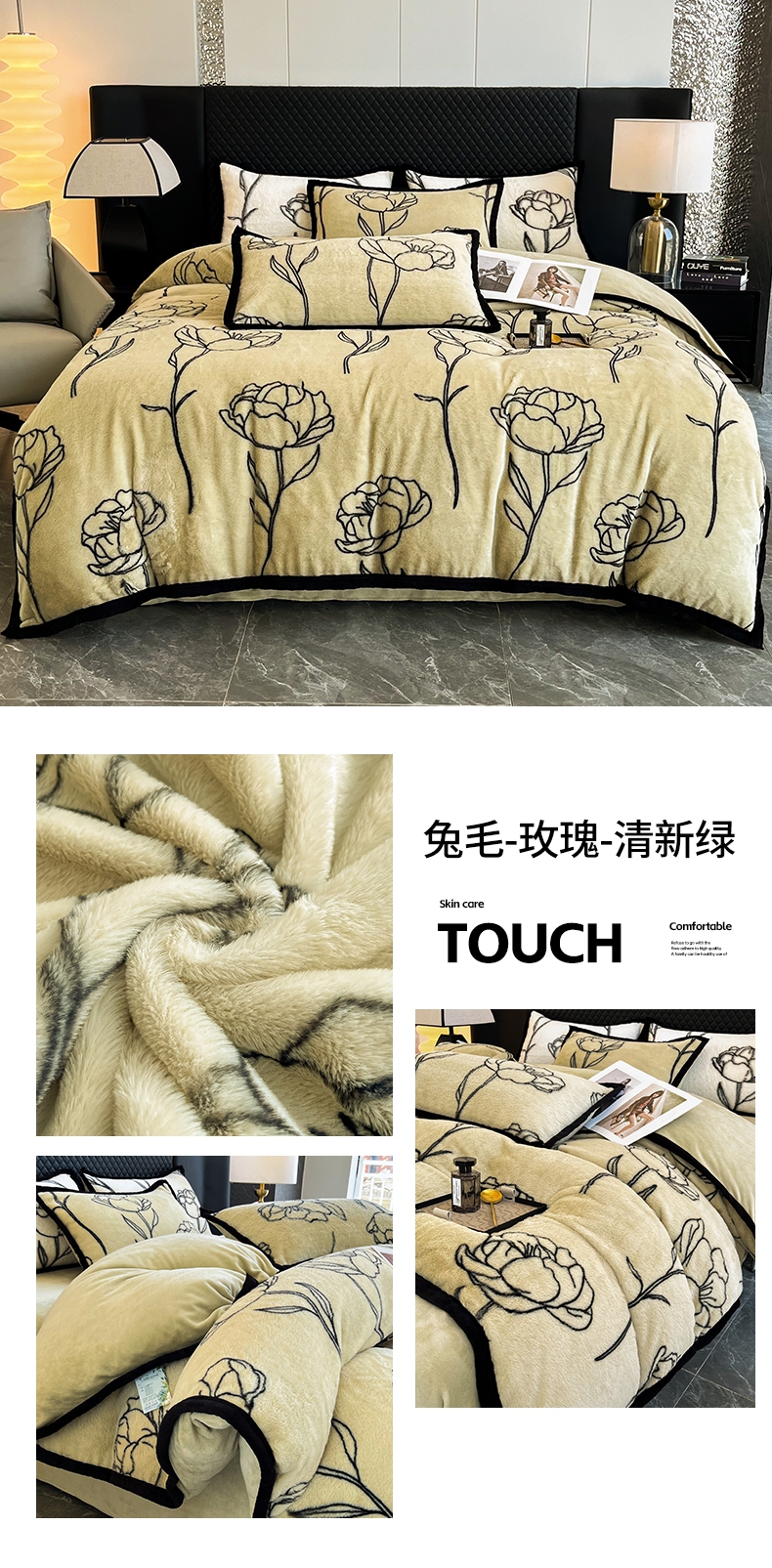 多乐家纺 2024新款高克重加厚保暖轻奢印花兔毛绒宽包边四件套 兔毛-玫瑰-奶白