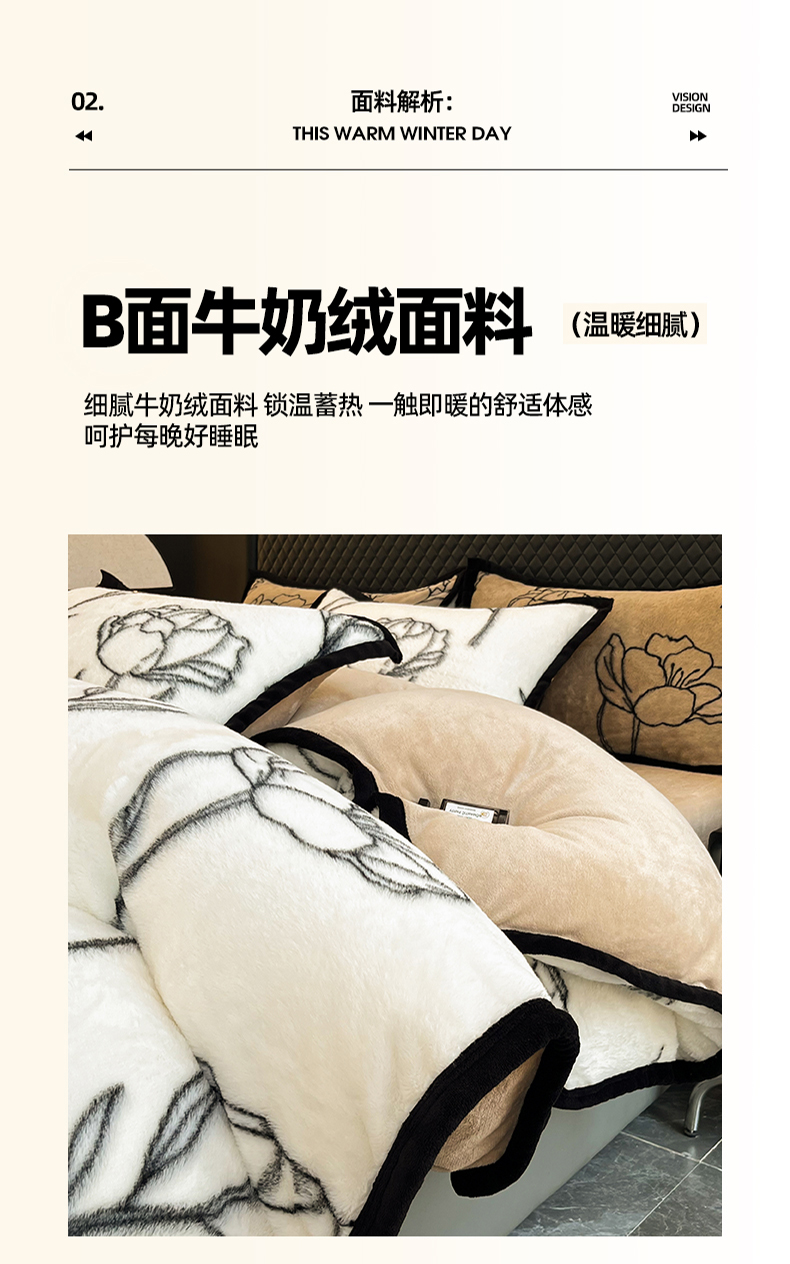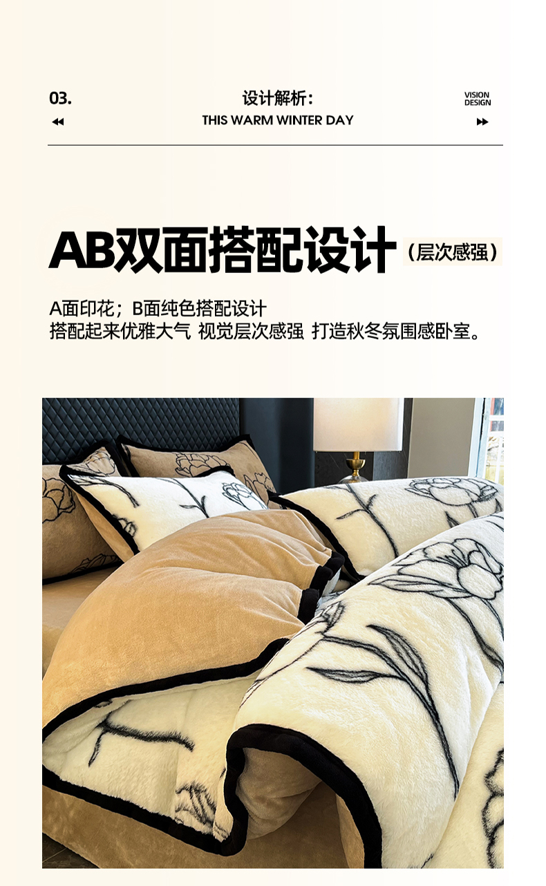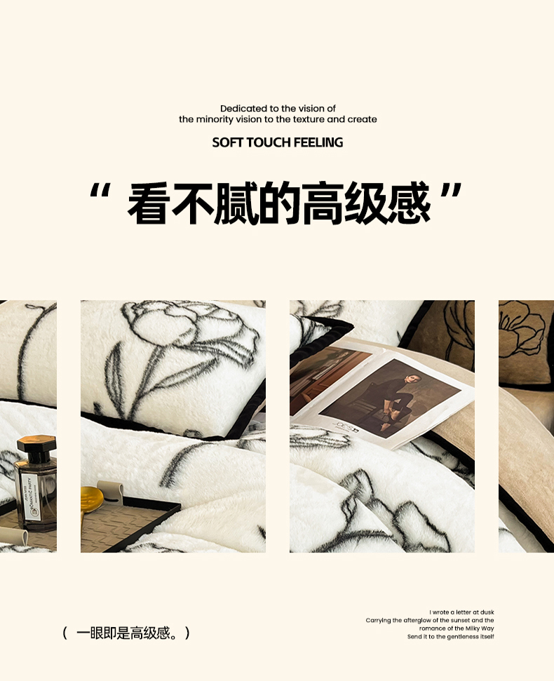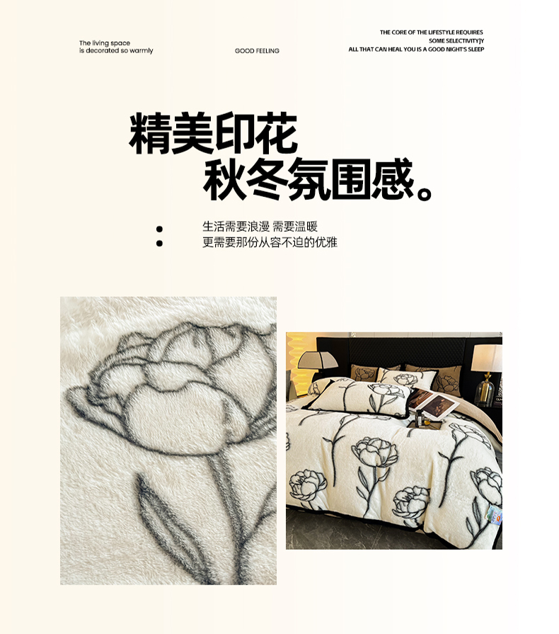 多乐家纺 2024新款高克重加厚保暖轻奢印花兔毛绒宽包边四件套 兔毛-玫瑰-奶白