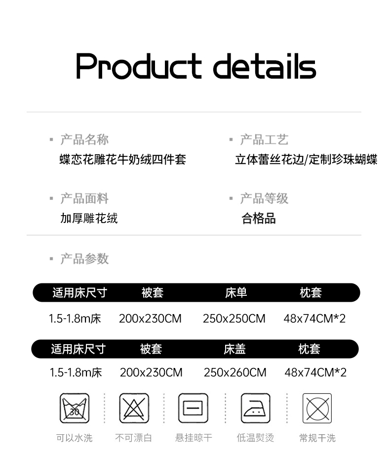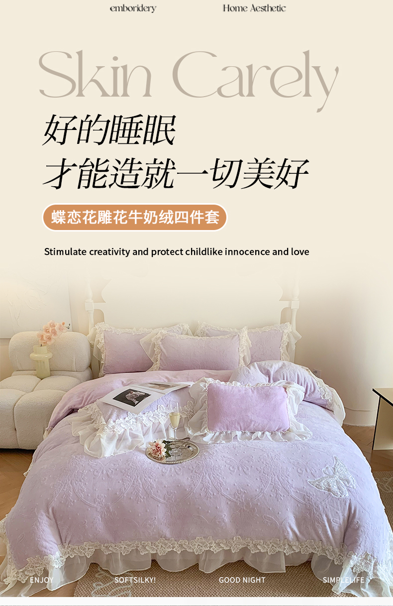 商品名称:吾欢心 2024新款蝶恋花高品质立体雕花绒加厚牛奶绒四件套床单款床盖款 绒蝶恋花紫