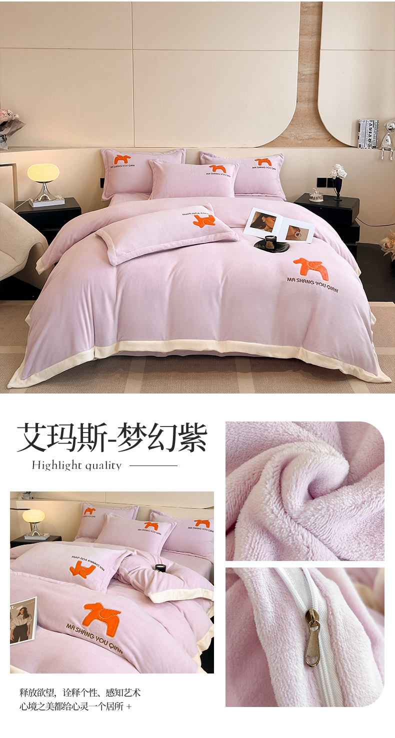 爱家(原缔乐家纺) 2024新款A类牛奶绒pu皮贴布四件套-艾玛斯 艾玛斯-梦幻紫