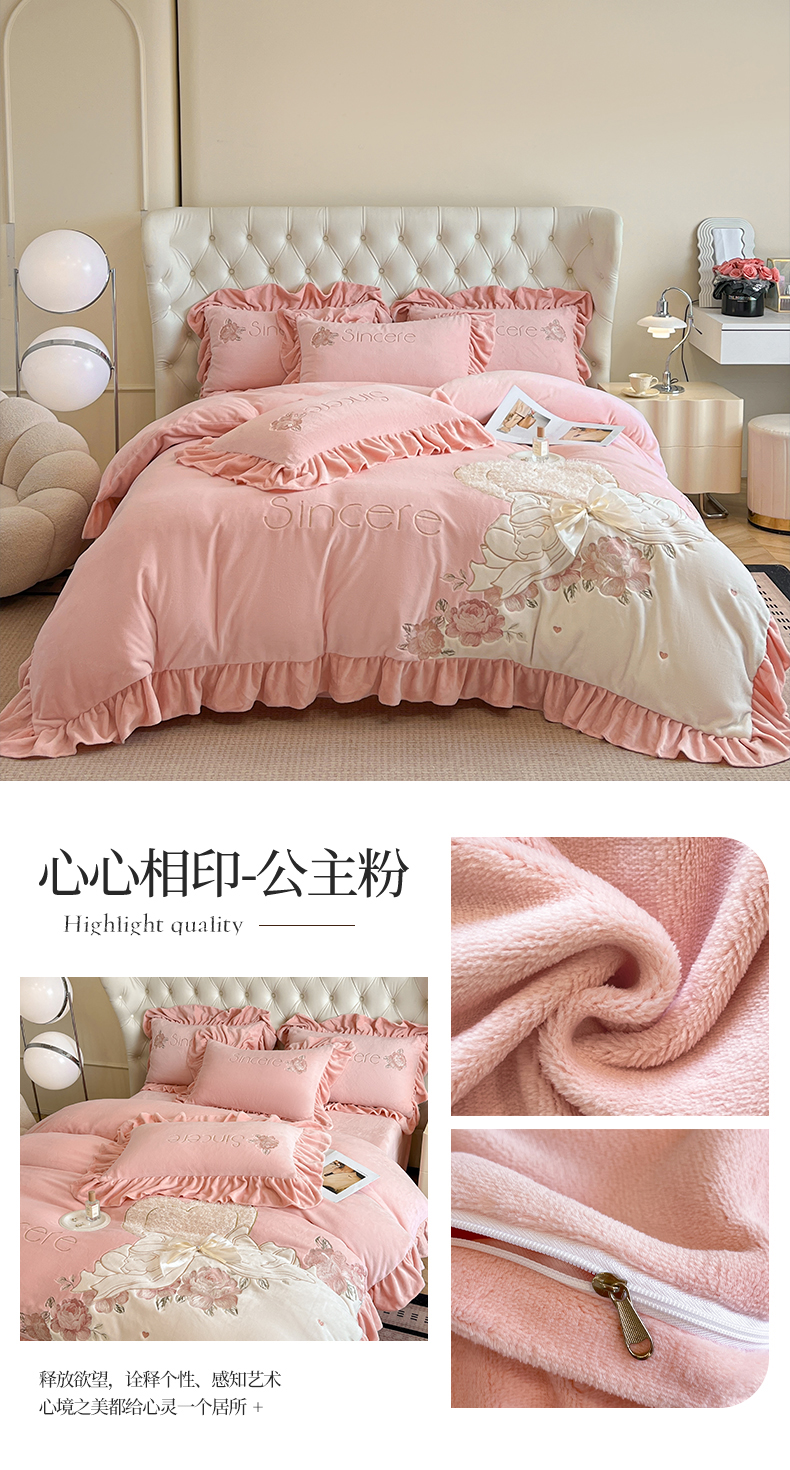 爱家(原缔乐家纺) 2024新款A类高克重牛奶绒立体花刺绣四件套-心心相印 心心相印-公主粉