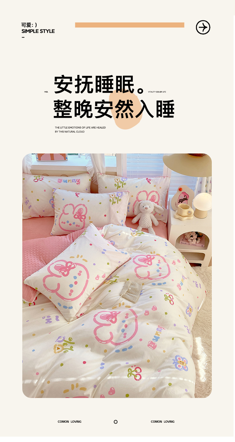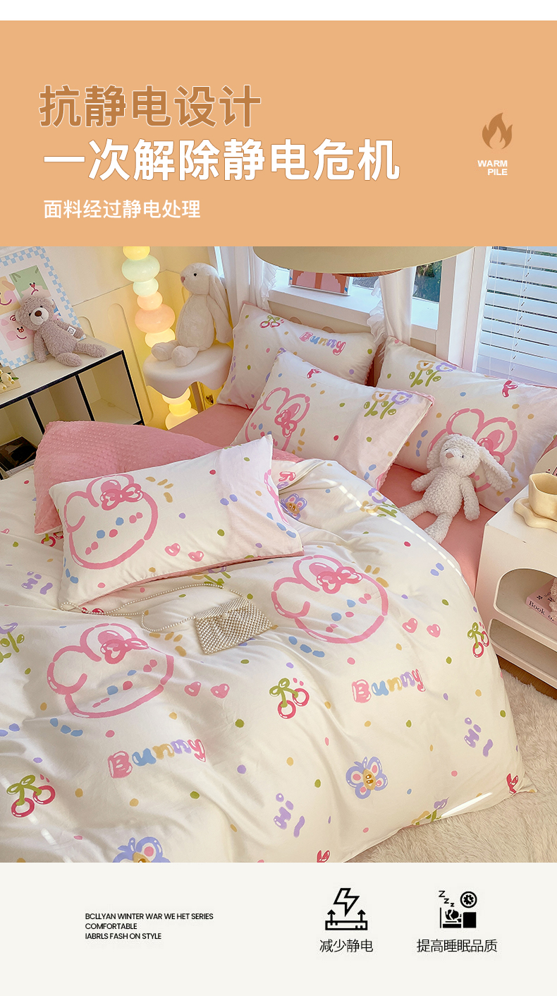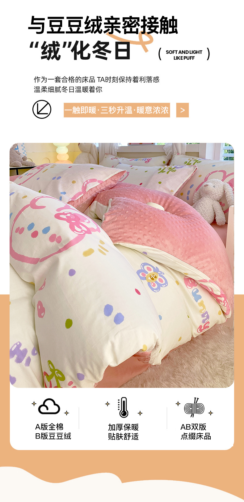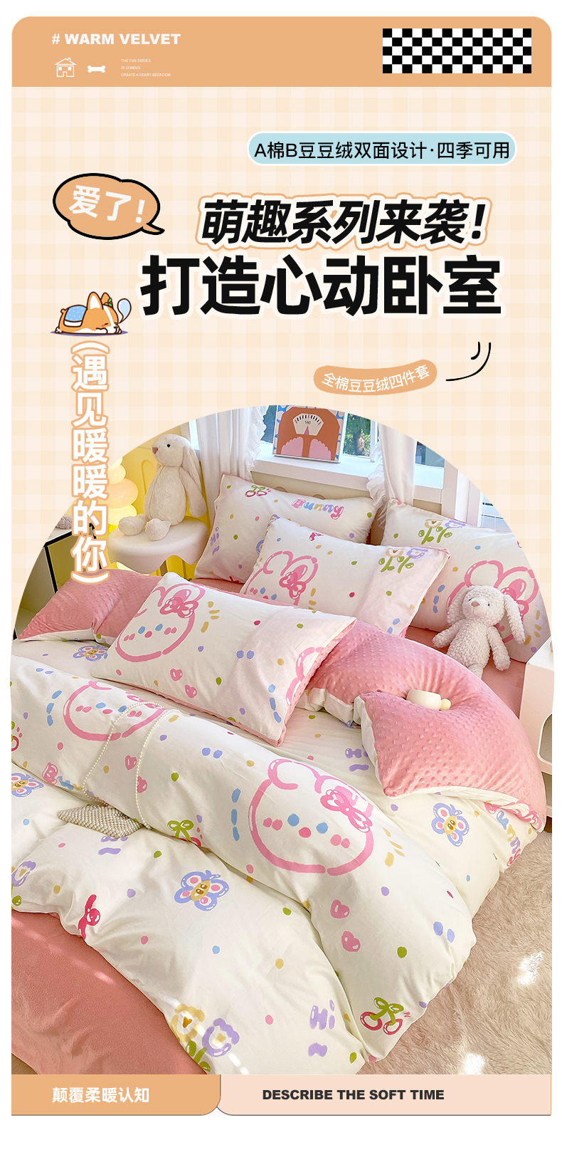 当前位置: 91家纺网 > 商品网购 > 床品套件 > 四件套 > 其它四件套 > 金鑫汇家纺 2024新款棉加豆豆绒系列四件套 奇趣小兔