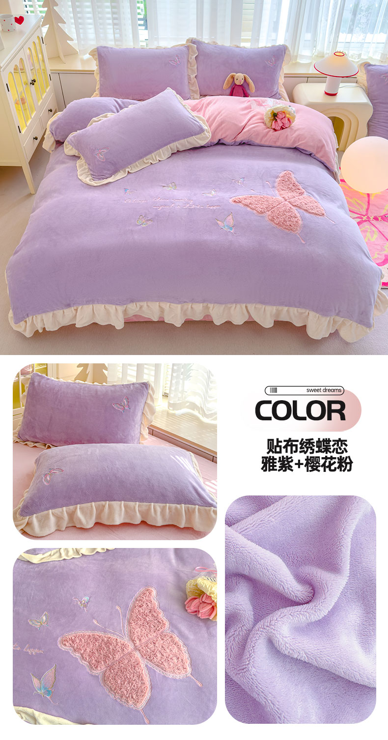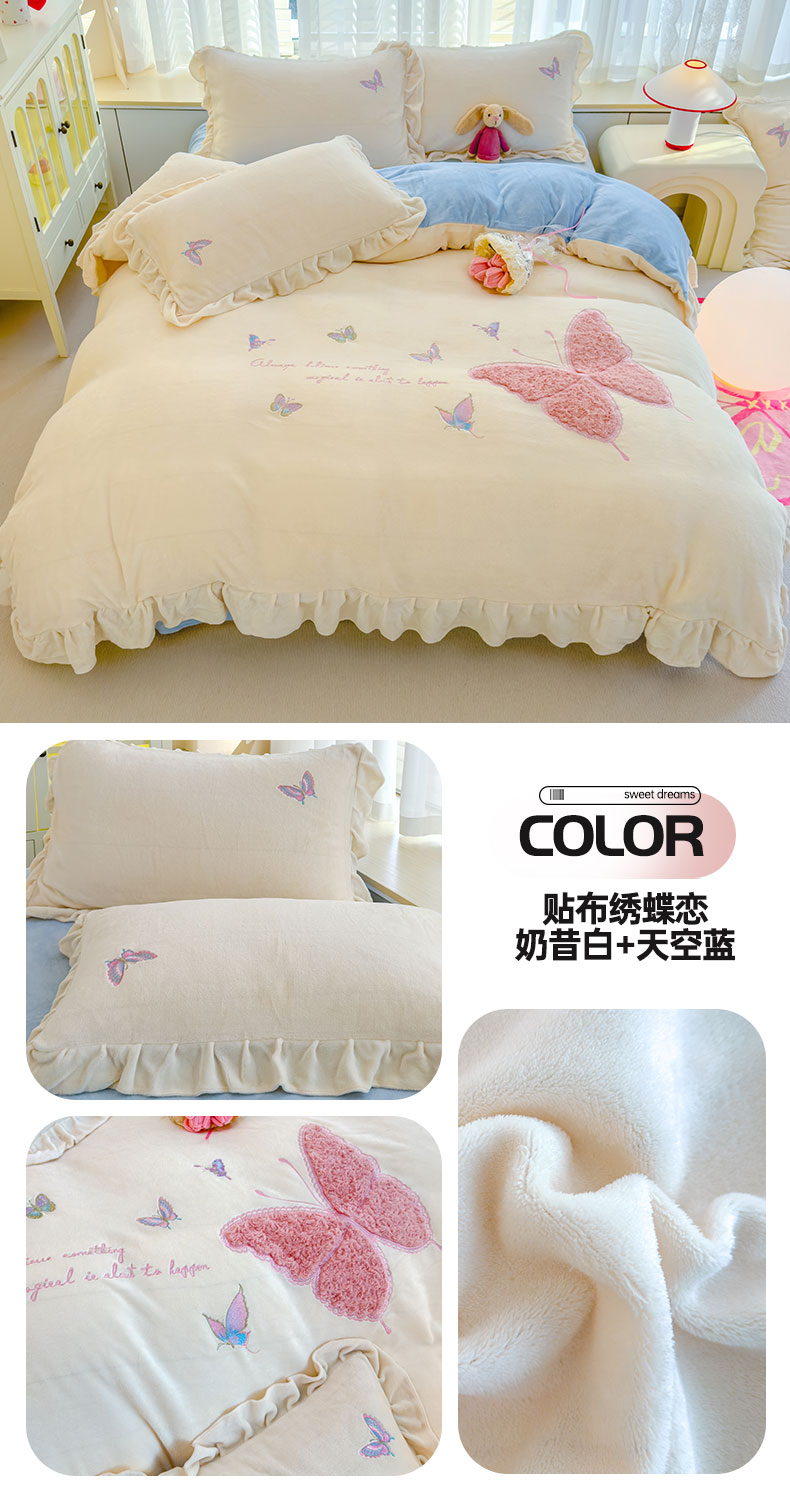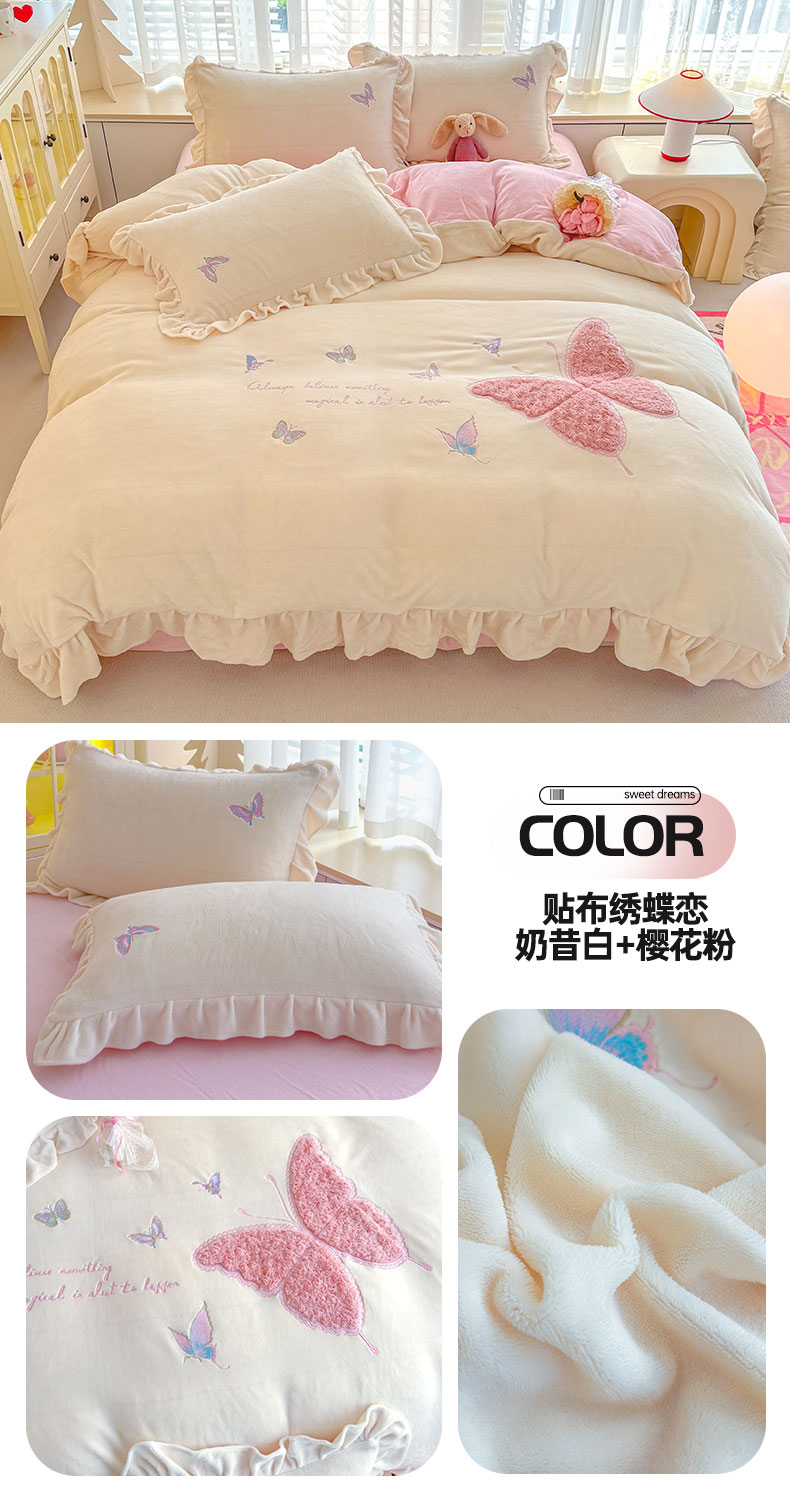 当前位置: 91家纺网 > 商品网购 > 床品套件 > 四件套 > 牛奶绒四件套 > 灰鲸 2025新款A类牛奶绒玫瑰兔毛贴布绣四件套 贴布绣蝶恋-奶昔白+樱花粉