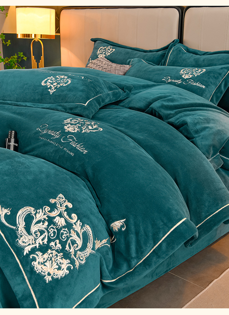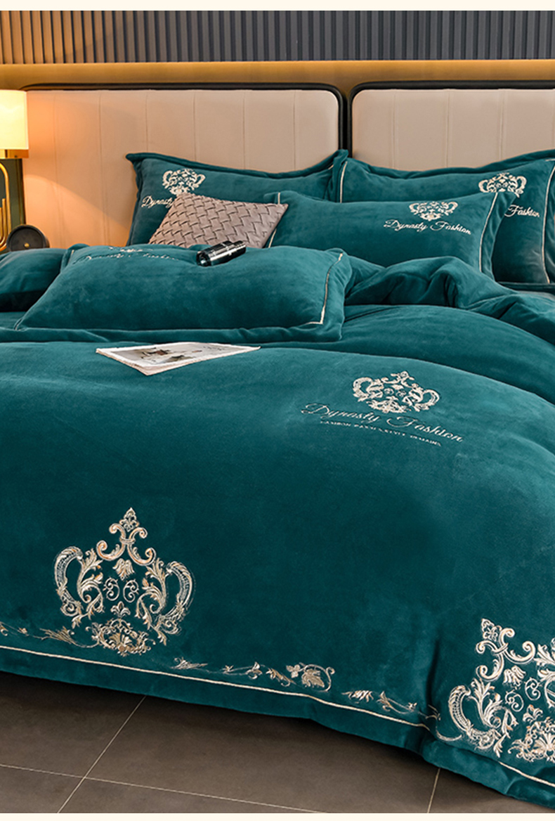 沐妍家纺 2024新款重工刺绣绣花纯色牛奶绒四件套皇冠-宝石蓝,皇冠-宝石蓝