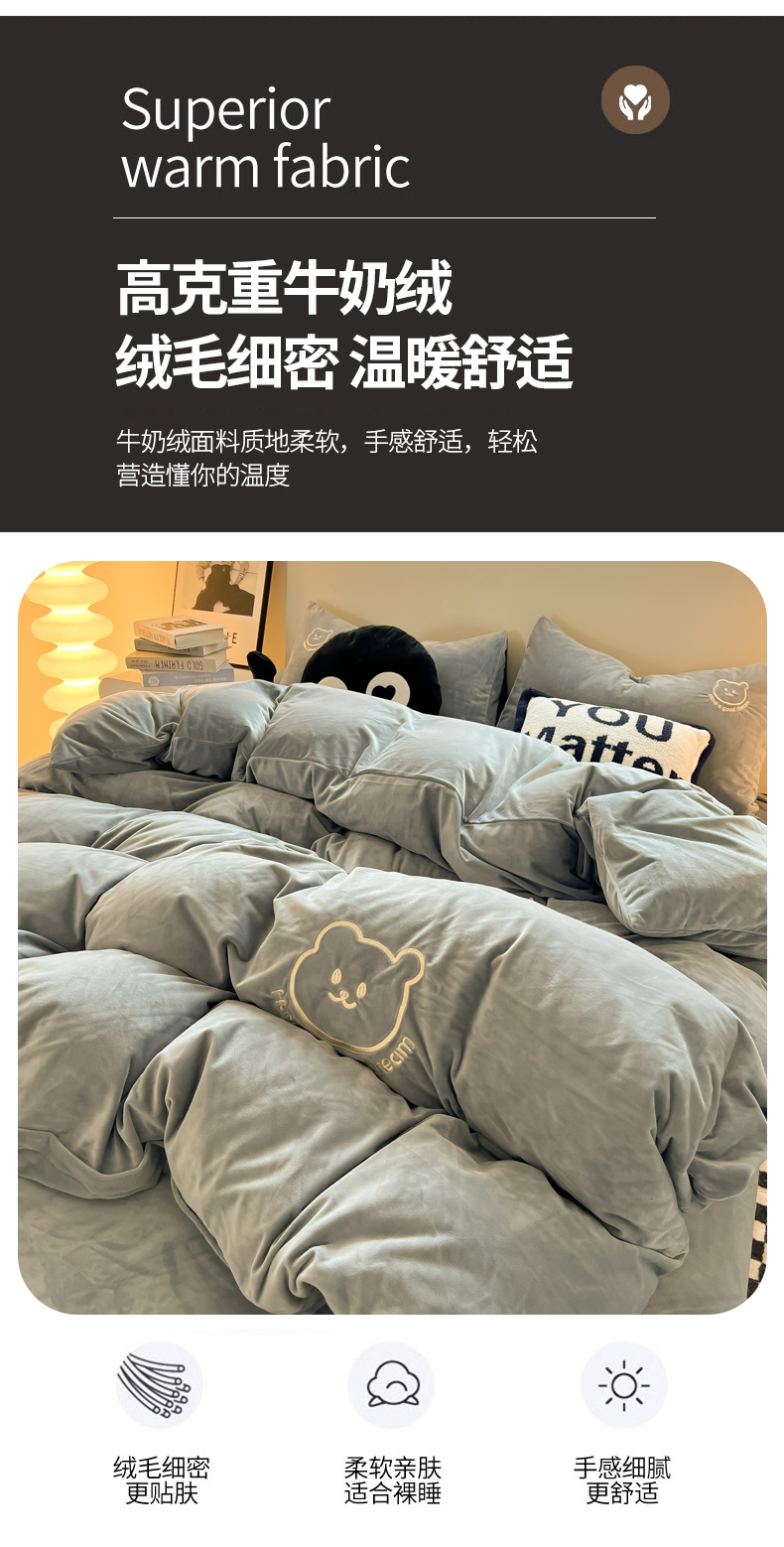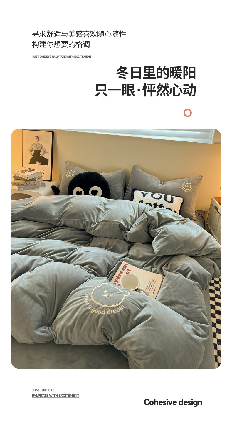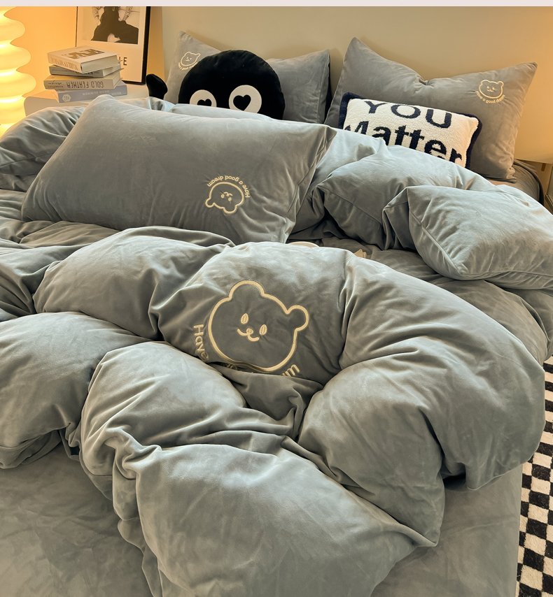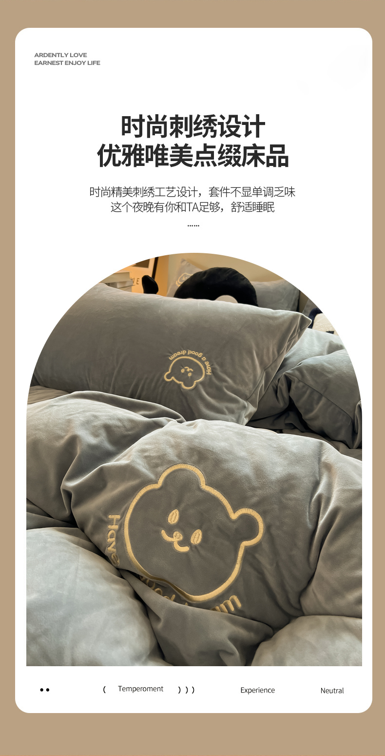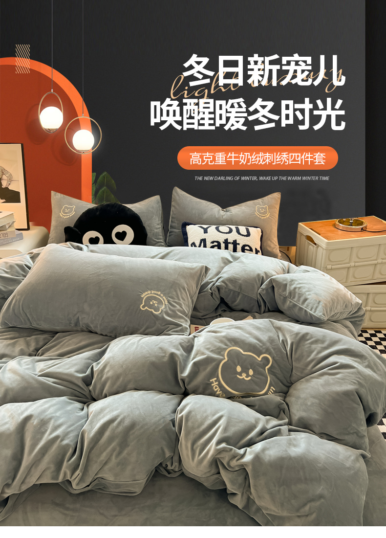 当前位置: 91家纺网 > 商品网购 > 床品套件 > 四件套 > 牛奶绒四件套 > yyds网供 【场景一】短绒小熊刺绣水晶绒四件套轻奢秋冬牛奶绒简约-小熊系列 小熊-浅灰