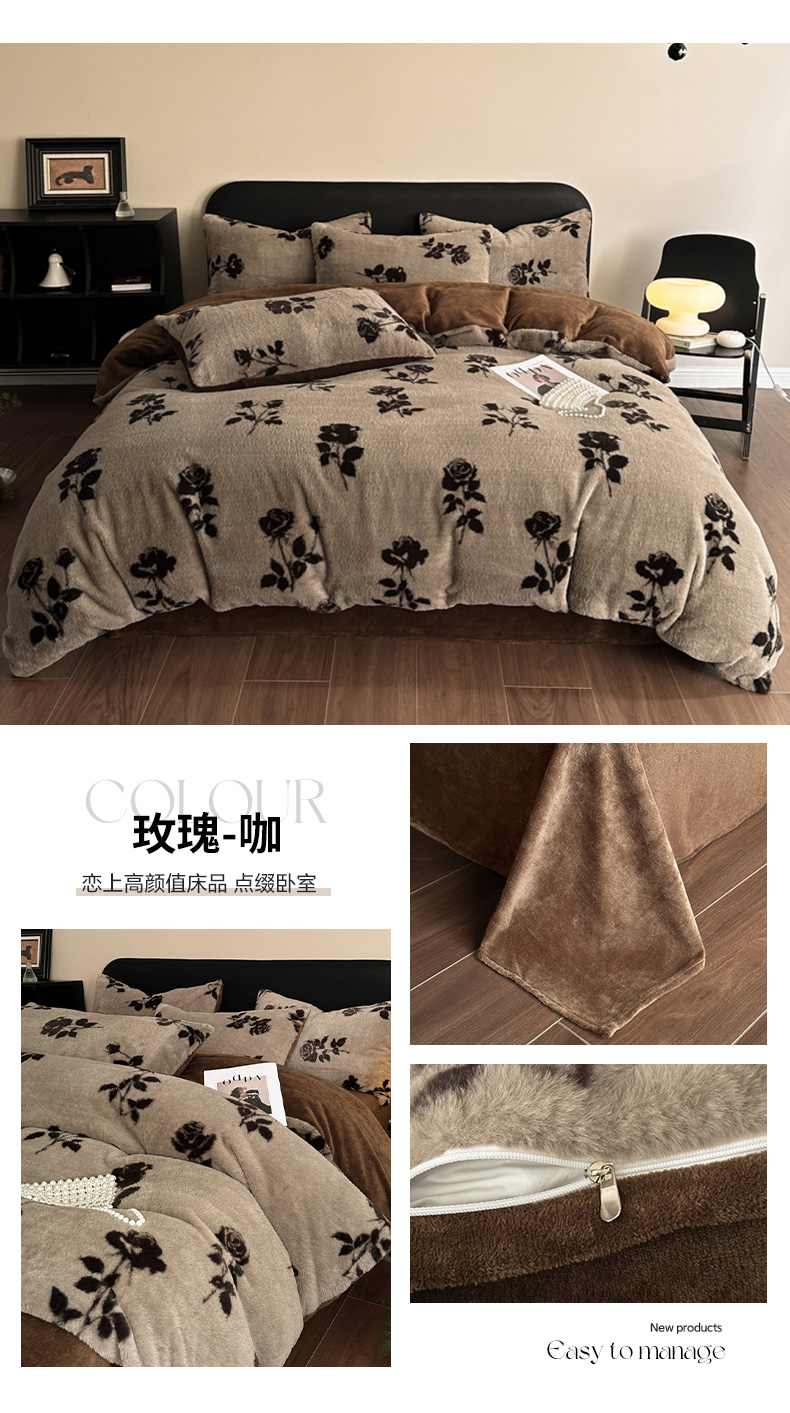 丝印良品 2024秋冬新款丹麦兔毛绒牛奶绒四件套玫瑰-咖