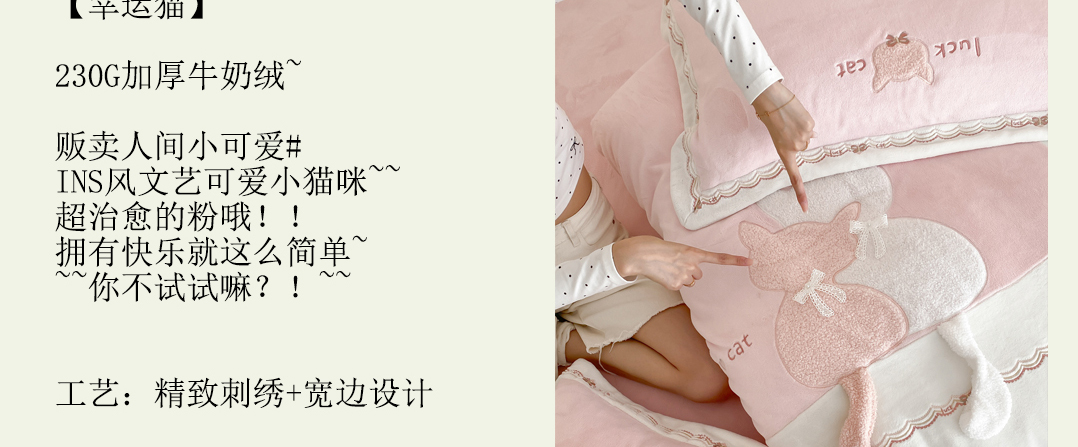 当前位置: 91家纺网 > 商品网购 > 床品套件 > 四件套 > 牛奶绒四件套 > (总)曼布缇 2025新品工艺款加厚牛奶绒绣花四件套-幸运猫