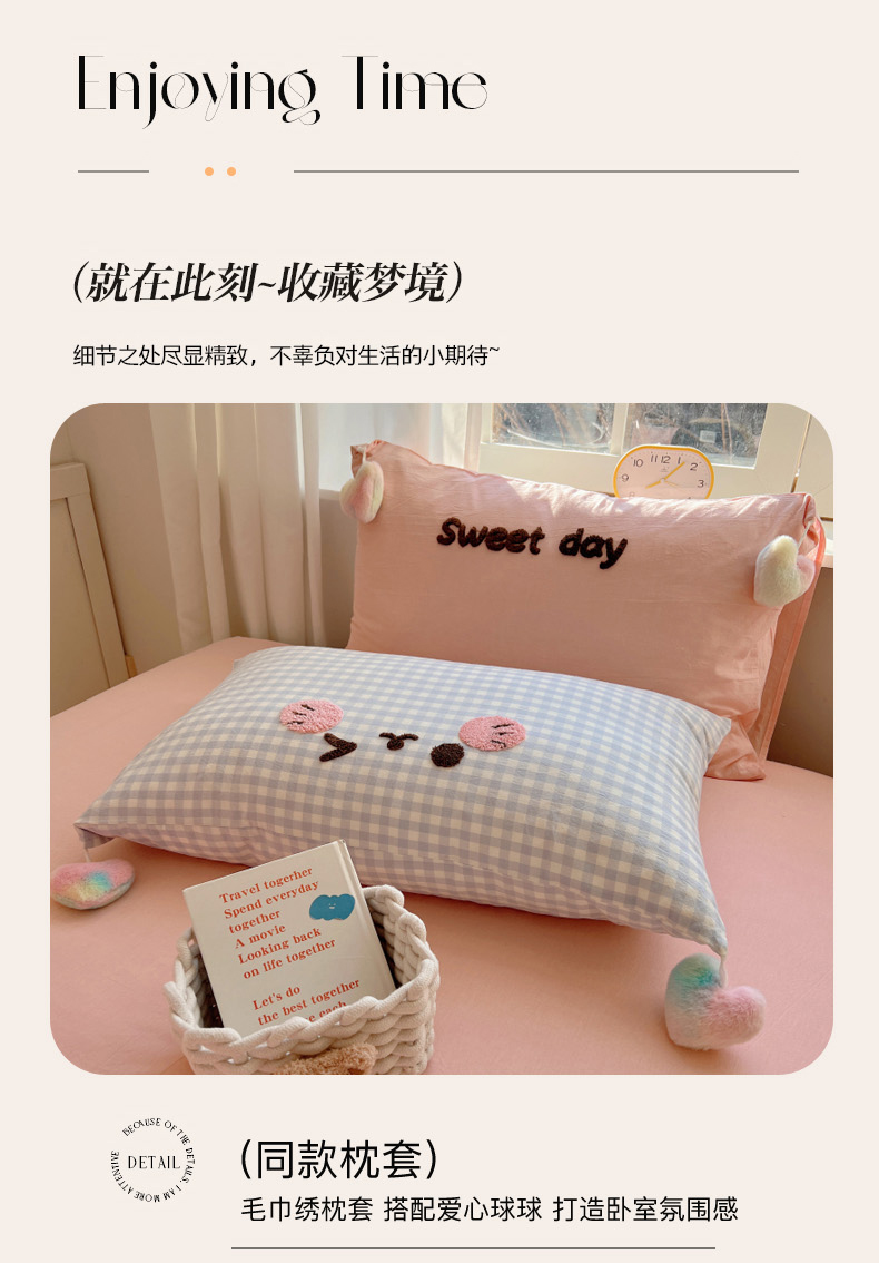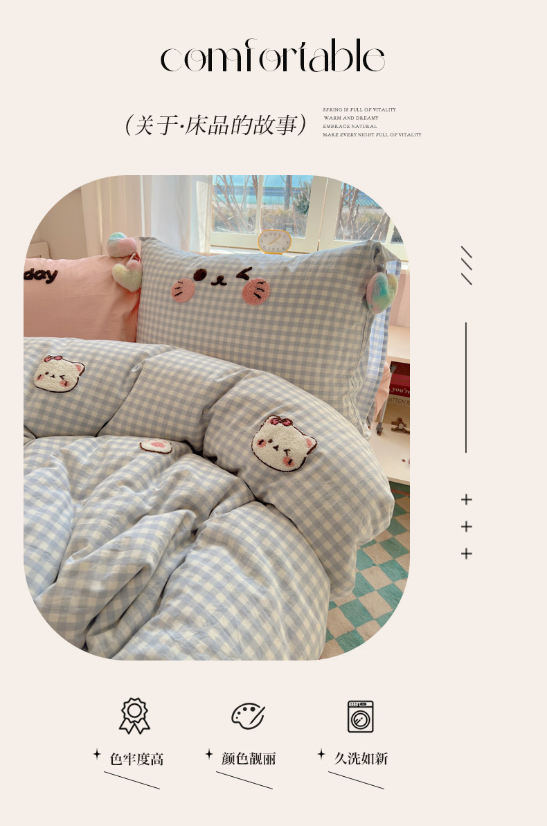 商品名称:2025新款全棉色织水洗棉毛巾绣四件套-毛球款 甜心小猫-蓝格
