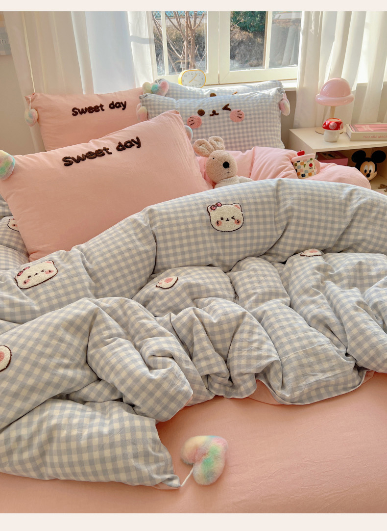 2025新款全棉色织水洗棉毛巾绣四件套-毛球款 甜心小猫-蓝格