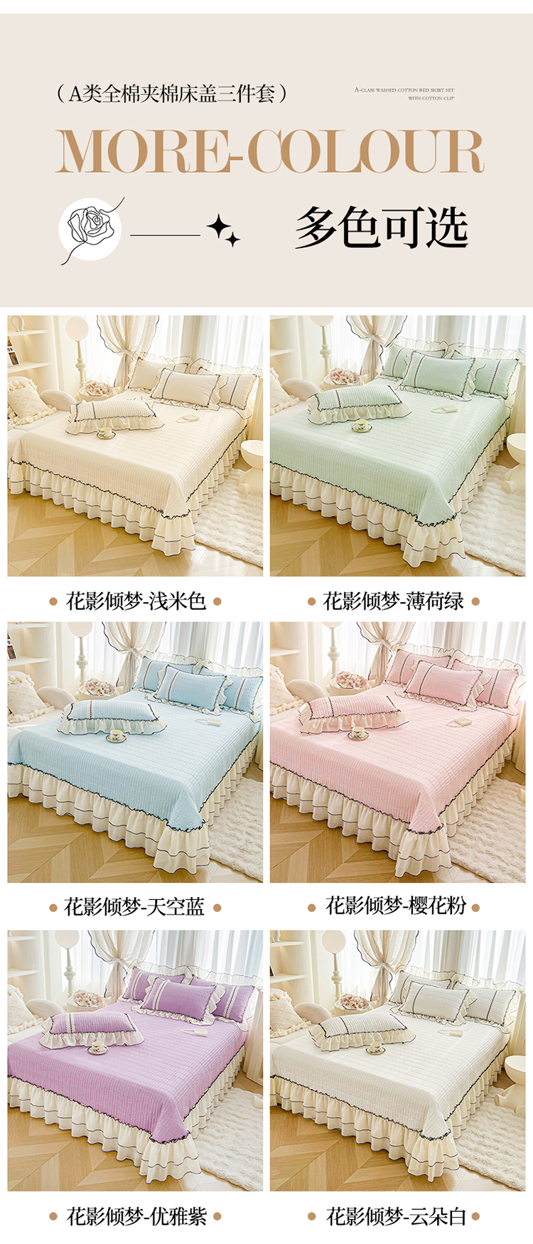 (总)虹星家纺 2025年新款全棉床盖三件套-花影倾梦,花影倾梦-浅米色,花影倾梦-薄荷绿,花影倾梦-天空蓝,花影倾梦-樱花粉,花影倾梦-优雅紫,花影倾梦-云朵白