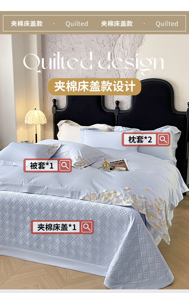 春夏A类长绒棉夹棉床盖床笠四件套全棉纯棉纯色绗绣四季款保护罩高级感床上用品 茉婉-慕蓝