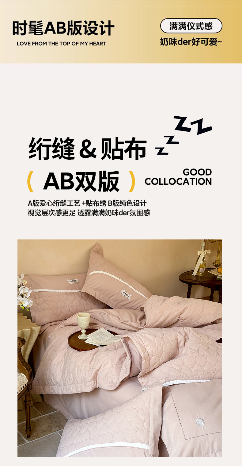 红番天家居馆 2025新款浪漫桃心-全棉绗缝磨毛四件套 奶咖