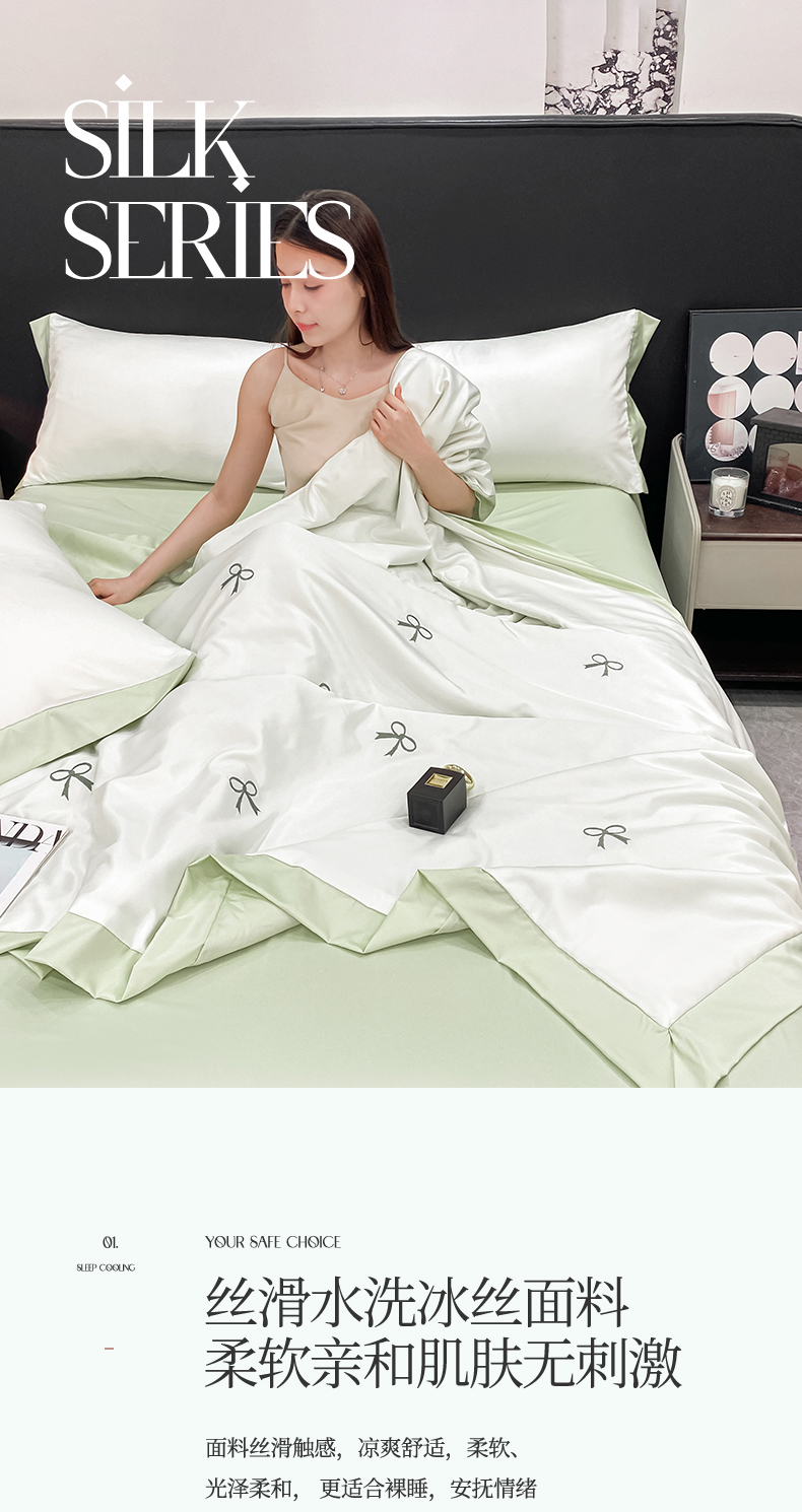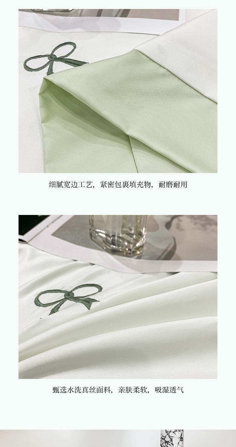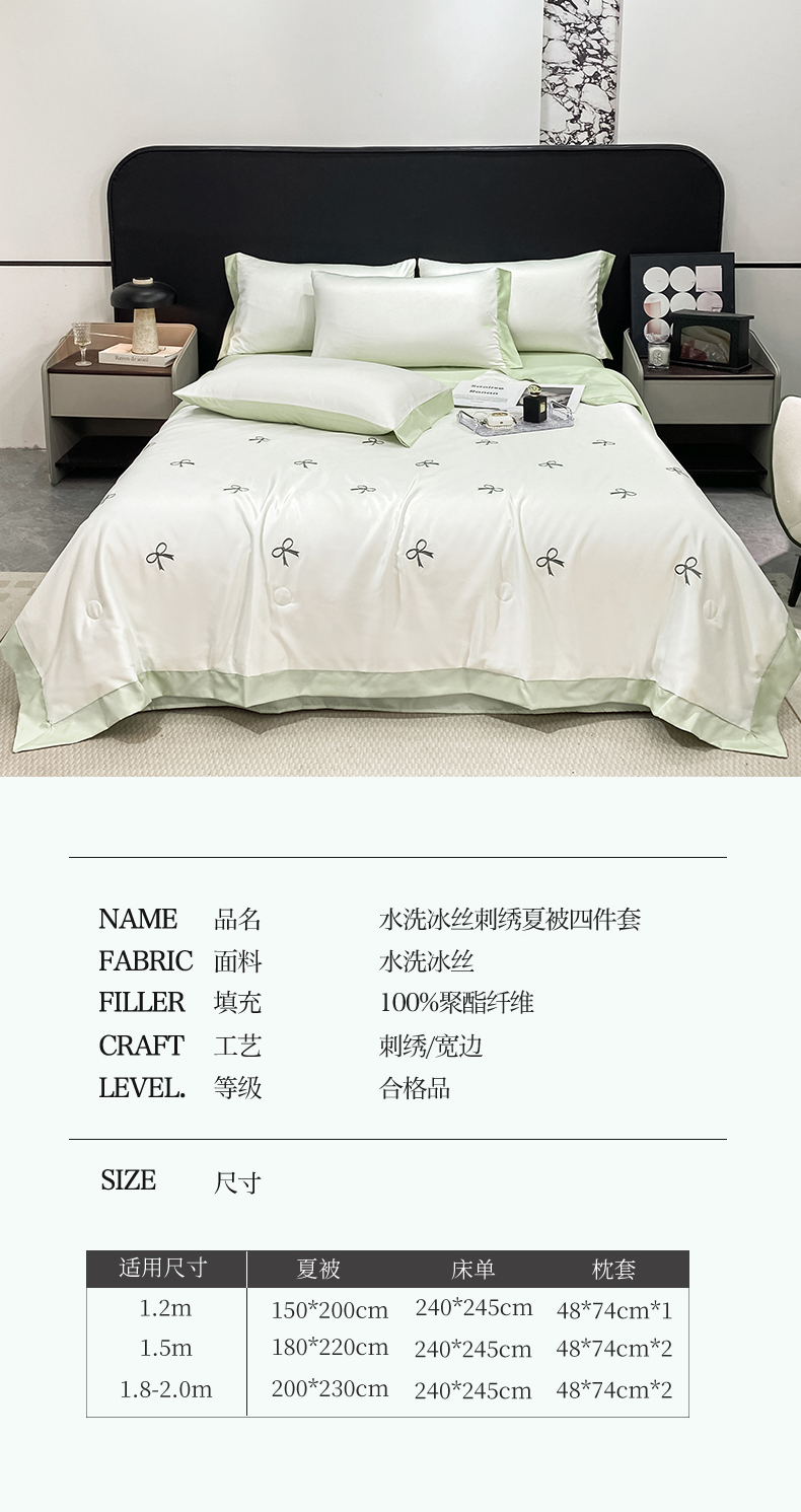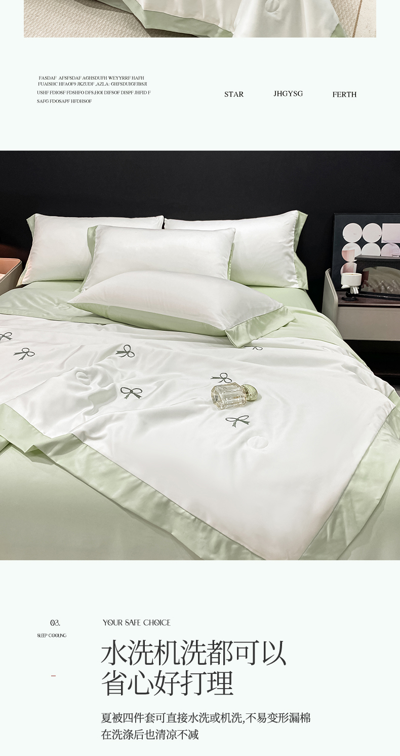 当前位置: 91家纺网 > 商品网购 > 床品套件 > 四件套 > 夏被四件套 > 牛牛家纺 2025新款水洗冰丝刺绣夏被四件套 蝴蝶结-奶白绿